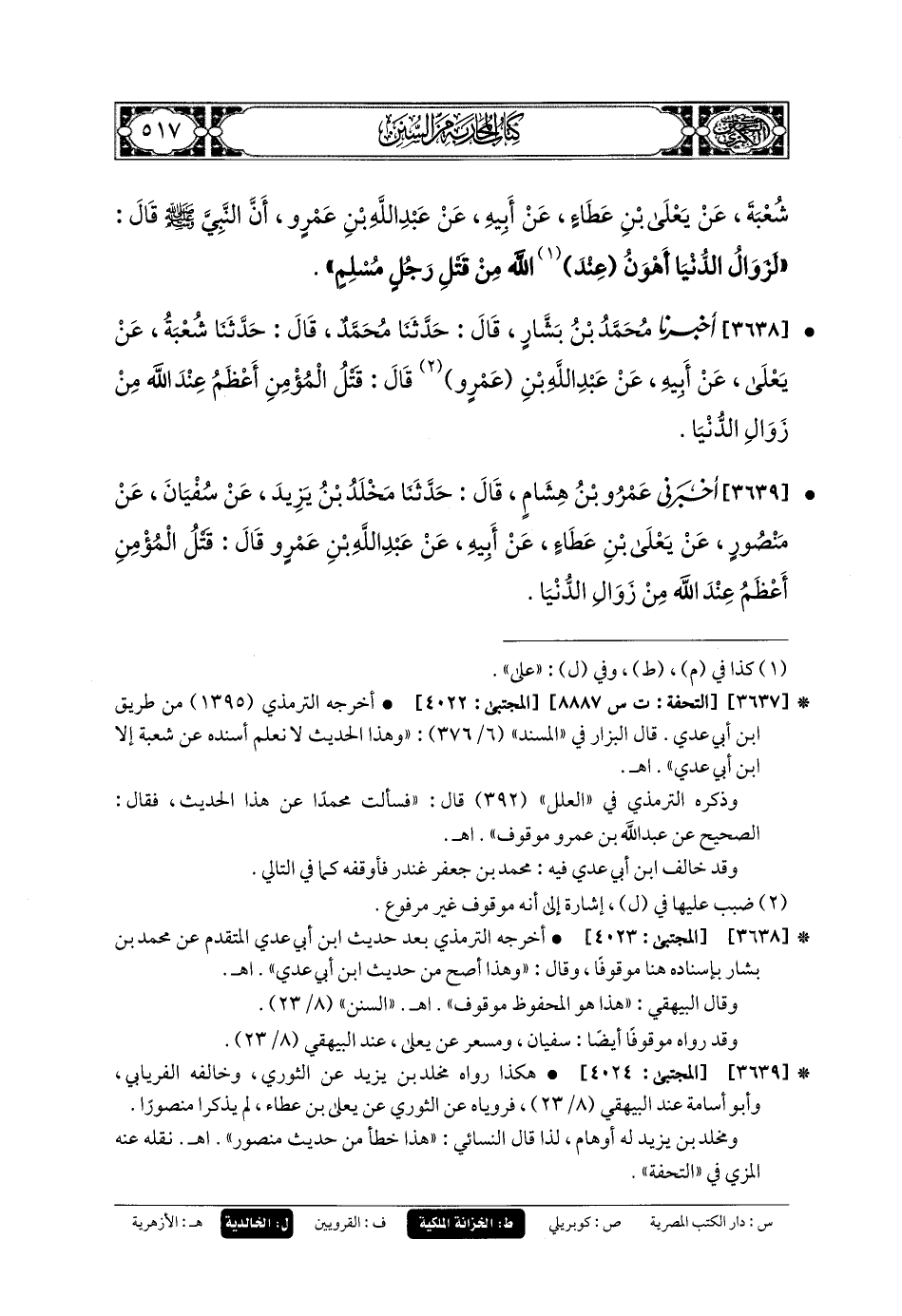 3638 - أَخبَرنا مُحَمدُ بنُ بَشَّارٍ، قَالَ: حَدثنا مُحَمدٌ، قَالَ: حَدثنا شُعبَةَ، عَن يَعْلَى، عَن أَبيهِ، عَن عَبدِ اللهِ بْنِ عَمْرٍو قَالَ: قَتْلُ المُؤْمِنِ أَعْظَمُ عِنْدَ اللهِ مِنْ زَوَالِ الدُّنْيَا.