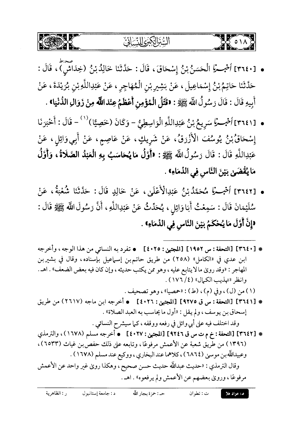 3641 - أَخبَرنا سَرِيعُ بنُ عَبدِ اللهِ الوَاسِطِيُّ، وَكَانَ خَصِيًّا (1)، قَالَ: أَخبَرنا إِسحَاقُ بنُ يُوسُفَ الأَزْرَقُ، عَن شَرِيكٍ، عَن عَاصِمٍ، عَن أَبي وَائِلٍ، عَن عَبدِ اللهِ قَالَ: قَالَ رَسُولُ اللهِ صَلى الله عَليه وسَلم: أَوَّلُ مَا يُحَاسَبُ بِهِ العَبدُ الصَّلاةُ، وَأَوَّلُ مَا يُقْضَى بَيْنَ النَّاسِ فِي الدِّمَاءِ.