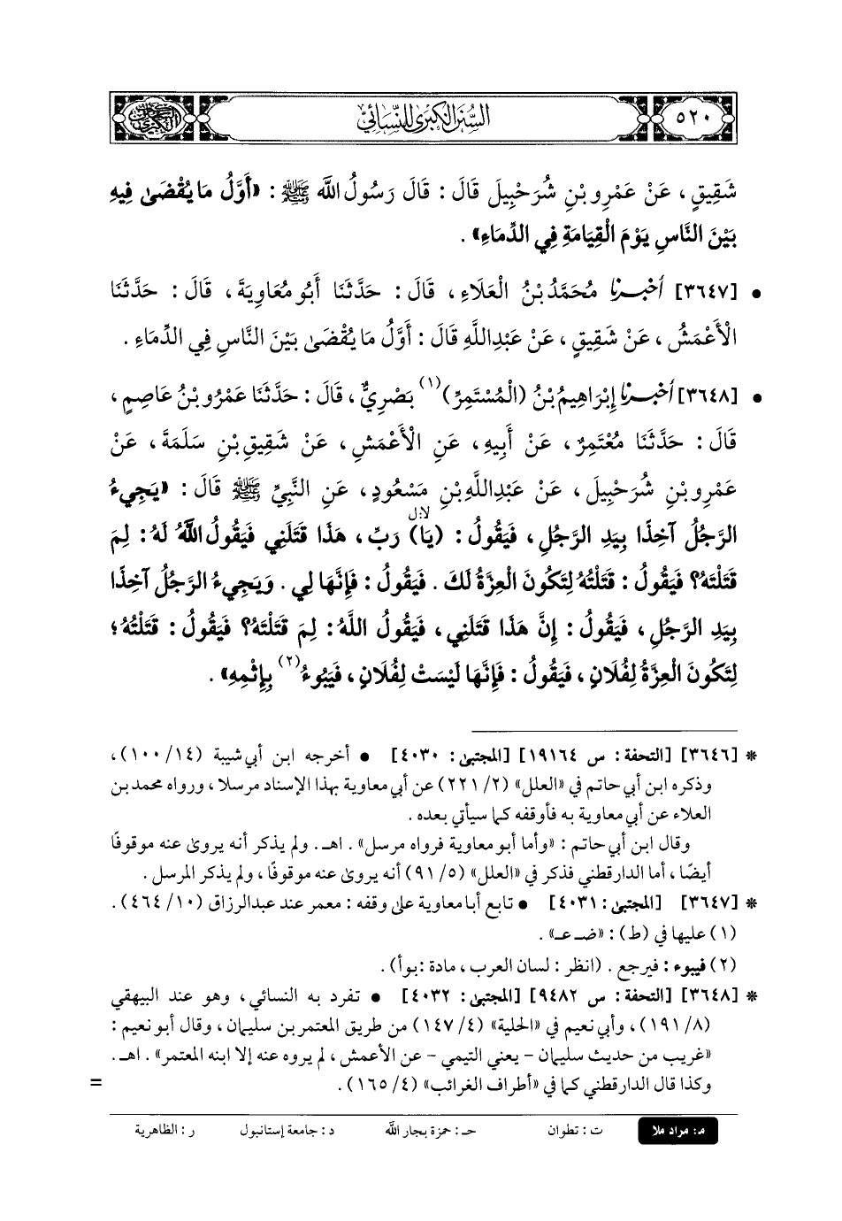 3648 - أَخبَرنا إِبرَاهِيمُ بنُ المُسْتَمِرِّ، بَصْرِيٌّ، قَالَ: حَدثنا عَمرُو بنُ عَاصِمٍ، قَالَ: حَدثنا مُعْتَمِرٌ، عَن أَبيهِ، عَنِ الأَعْمَشِ، عَن شَقِيقِ بْنِ سَلَمَةَ، عَن عَمْرِو بْنِ شُرَحْبِيلٍ، عَن عَبدِ اللهِ بْنِ مَسْعُودٍ، عَنِ النَّبِيِّ صَلى الله عَليه وسَلم قَالَ: يَجِيءُ الرَّجُلُ آخِذًا بِيَدِ الرَّجُلِ، فَيَقُولُ: يَا رَبِّ هَذَا قَتَلَنِي، فَيَقُولُ اللهُ لَهُ: لِمَ قَتَلْتَهُ؟ فَيَقُولُ: قَتَلْتُهُ لِتَكُونَ العِزَّةُ لَكَ، فَيَقُولُ: فَإِنَّهَا لِي، وَيَجِيءُ الرَّجُلُ آخِذًا بِيَدِ الرَّجُلِ، فَيَقُولُ: إِنَّ هَذَا قَتَلَنِي، فَيَقُولُ اللهُ لَهُ: لِمَ قَتَلْتَهُ؟ فَيَقُولُ: قَتَلْتُهُ لِتَكُونَ العِزَّةُ لِفُلانٍ، فَيَقُولُ: فَإِنَّهَا لَيْسَتْ لِفُلانٍ، فَيَبُوءُ بِإِثْمِهِ.