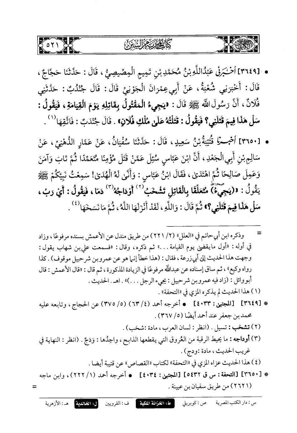 3649 - أَخبَرني عَبدُ اللهِ بنُ مُحَمدِ بْنِ تَمِيمٍ المِصِّيصِيُّ، قَالَ: حَدثنا حَجَّاجٌ، قَالَ: أَخبَرني شُعبَةُ، عَن أَبي عِمْرَانَ الجَوْنِيِّ، قَالَ: قَالَ جُنْدُبٌ: حَدَّثَنِي فُلانٌ، أَنَّ رَسُولَ اللهِ صَلى الله عَليه وسَلم قَالَ: يَجِيءُ المَقْتُولُ بِقَاتِلِهِ يَوْمَ القِيَامَةِ، فَيَقُولُ: سَلْ هَذَا فِيمَ قَتَلَنِي؟ فَيَقُولُ: قَتَلْتُهُ عَلَى مُلْكِ فُلانٍ.