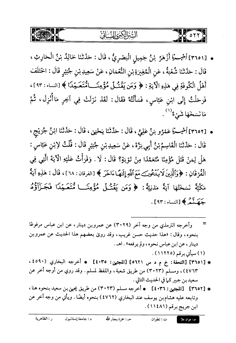 3651 - أَخبَرنا أَزْهَرُ بنُ جَمِيلٍ البَصْرِيُّ، قَالَ: حَدثنا خَالِدُ بنُ الحَارِثِ، قَالَ: حَدثنا شُعبَةُ، عَنِ المُغِيرَةِ بْنِ النُّعْمَانِ، عَن سَعِيدِ بْنِ جُبَيرٍ قَالَ: اخْتَلَفَ أَهْلُ الكُوفَةِ فِي هَذِهِ الآيَةِ: {وَمَنْ يَقْتُلْ مُؤْمِنًا مُتَعَمِّدًا} فَرَحَلْتُ إِلَى ابنِ عَبَّاسٍ، فَسَأَلْتُهُ فَقَالَ: لَقَدْ نَزَلَتْ فِي آخِرِ مَا أُنْزِلَ، ثُمَّ مَا نَسَخَهَا شَيْءٌ.