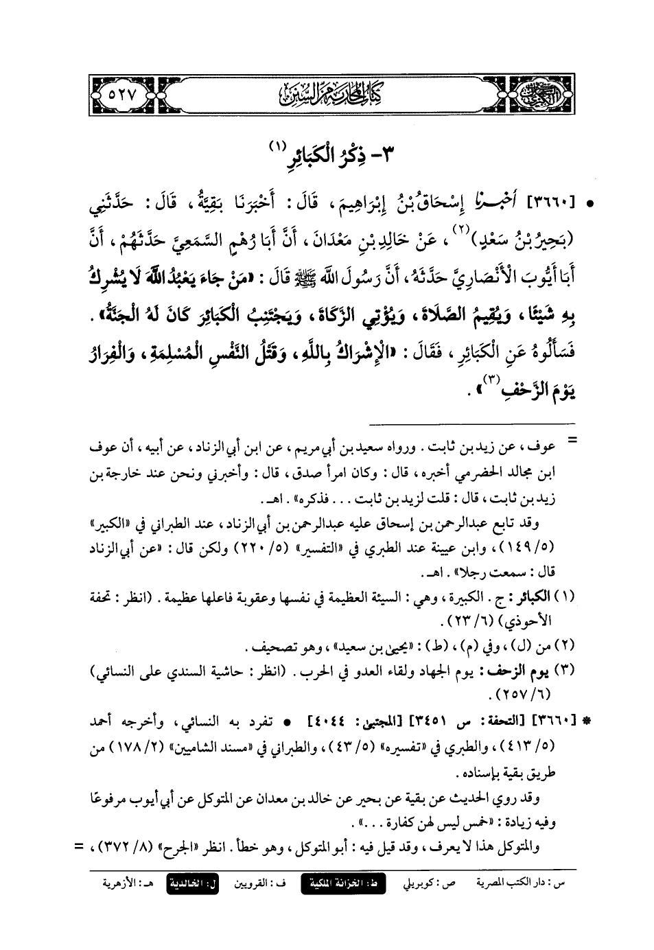 3660 - أَخبَرنا إِسحَاقُ بنُ إِبرَاهِيمَ، قَالَ: أَخبَرنا بَقِيَّةُ، قَالَ: حَدَّثَنِي بَحِيرُ بنُ سَعْدٍ، عَن خَالِدِ بْنِ مَعْدَانَ، أَنَّ أَبَا رُهْمٍ السَّمَعِيَّ حَدَّثَهُمْ، أَنَّ أَبَا أَيُّوبَ الأَنْصَارِيَّ حَدَّثَهُ، أَنَّ رَسُولَ اللهِ صَلى الله عَليه وسَلم قَالَ: مَنْ جَاءَ يَعْبُدُ اللهَ لا يُشْرِكُ بِهِ شَيْئًا، وَيُقِيمُ الصَّلاةَ، وَيُؤْتِي الزَّكَاةَ، وَيَجْتَنِبُ الكَبَائِرَ، كَانَ لَهُ الجَنَّةُ، فَسَأَلُوهُ عَنِ الكَبَائِرِ، فَقَالَ: الإِشْرَاكُ بِاللهِ، وَقَتْلُ النَّفْسِ المُسْلِمَةِ، وَالفِرَارُ يَوْمَ الزَّحْفِ.