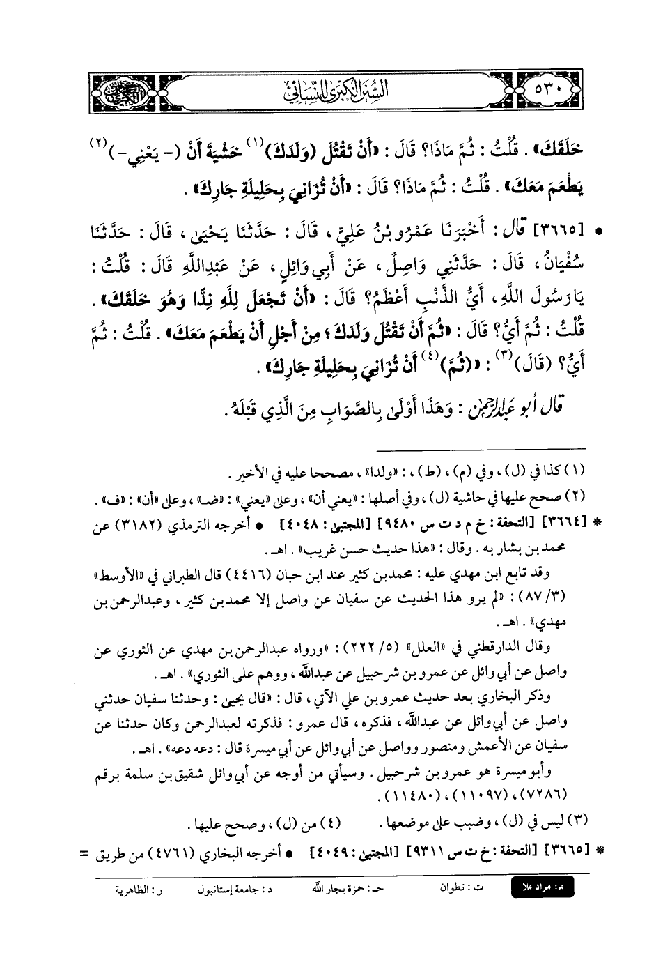 3665 - قَالَ: أَخبَرنا عَمرُو بنُ عَليٍّ، قَالَ: حَدثنا يَحيَى، قَالَ: حَدثنا سُفْيَانُ، قَالَ: حَدَّثَنِي وَاصِلٌ، عَن أَبي وَائِلٍ، عَن عَبدِ اللهِ، قَالَ: قُلْتُ: يَا رَسُولَ اللهِ، أَيُّ الذَّنْبِ أَعْظَمُ؟ قَالَ: أَنْ تَجْعَلَ للهِ نِدًّا وَهُوَ خَلَقَكَ، قُلْتُ: ثُمَّ أَيٌّ؟ قَالَ: ثُمَّ أَنْ تَقْتُلَ وَلَدَكَ مِنْ أَجْلِ أَنْ يَطْعَمَ مَعَكَ، قُلْتُ: ثُمَّ أَيٌّ؟ قَالَ: ثُمَّ أَنْ تُزَانِيَ بِحَلِيلَةِ جَارِكَ.