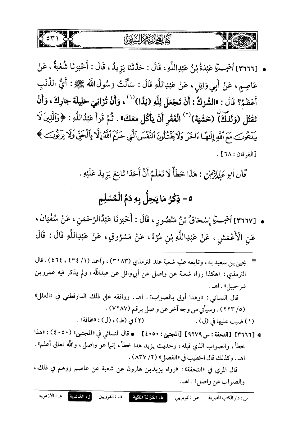 3666 - أَخبَرنا عَبدَةُ بنُ عَبدِ اللهِ، قَالَ: حَدثنا يَزِيدُ، قَالَ: أَخبَرنا شُعبَةُ، عَن عَاصِمٍ، عَن أَبي وَائِلٍ، عَن عَبدِ اللهِ قَالَ: سَأَلْتُ رَسُولَ اللهِ صَلى الله عَليه وسَلم: أَيُّ الذَّنْبِ أَعْظَمُ؟ قَالَ: الشِّرْكُ؛ أَنْ تَجْعَلَ للهِ نِدًا، وَأَنْ تُزَانِي حَلِيلَةَ جَارِكَ، وَأَنْ تَقْتُلَ وَلَدَكَ خَشْيَةَ الفَقْرِ أَنْ يَأْكُلَ مَعْكَ، ثُمَّ قَرَأَ عَبدُ اللهِ: {وَالَّذِينَ لا يَدْعُونَ مَعَ اللهِ إِلَهًا آخَرَ وَلا يَقْتُلُونَ النَّفْسَ الَّتِى حَرَّمَ اللهُ إِلاَّ بِالحَقِّ وَلا يَزْنُونَ}.