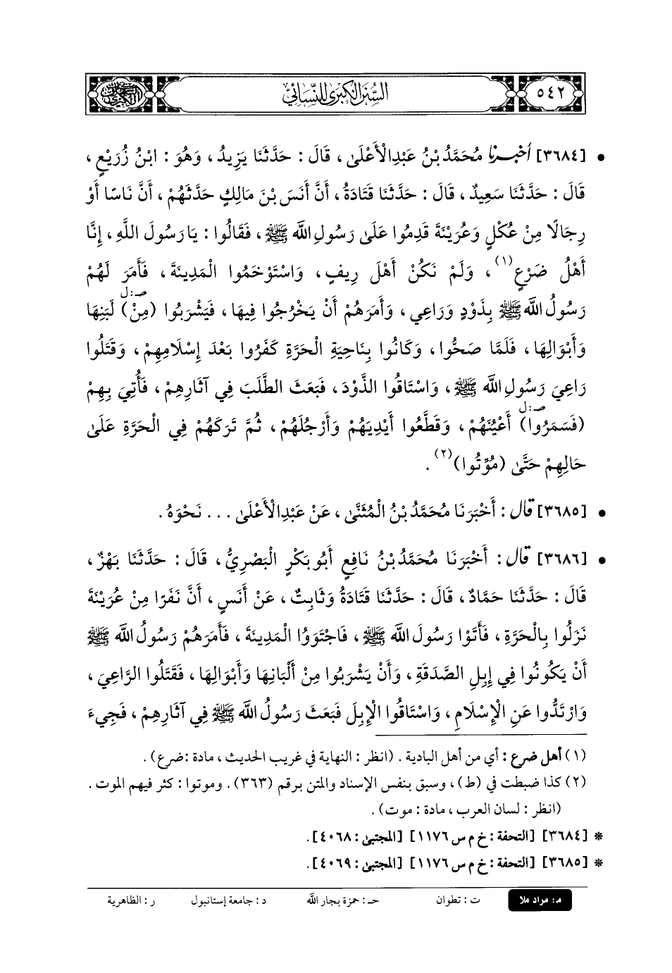 3686 - قَالَ: أَخبَرنا مُحَمدُ بنُ نَافِعٍ أَبو بَكْرٍ البَصْرِيُّ، قَالَ: حَدثنا بَهْزٌ، قَالَ: حَدثنا حَمَّادٌ، قَالَ: حَدثنا قَتَادَةُ، وَثَابِتٌ، عَن أَنَسٍ، أَنَّ نَفَرًا مِنْ عُرَيْنَةَ نَزَلُوا بِالحَرَّةِ، فَأَتَوْا رَسُولَ اللهِ صَلى الله عَليه وسَلم، فَاجْتَوَوُا المَدِينَةَ، فَأَمَرَهُمْ رَسُولُ اللهِ صَلى الله عَليه وسَلم أَنْ يَكُونُوا فِي إِبِلِ الصَّدَقَةِ، وَأَنْ يَشْرَبُوا مِنْ أَلْبَانِهَا وَأَبْوَالِهَا، فَقَتَلُوا الرَّاعِيَ، وَارْتَدُّوا عَنِ الإِسلامِ، وَاسْتَاقُوا الإِبِلَ، فَبَعَثَ رَسُولُ اللهِ صَلى الله عَليه وسَلم فِي آثَارِهِمْ، فَجِيءَ بِهِمْ، فَقَطَّعَ أَيْدِيَهُمْ وَأَرْجُلَهُمْ، وَسَمَرَ أَعْيُنَهُمْ، وَأَلْقَاهُمْ فِي الحَرَّةِ، قَالَ أَنَسٌ: فَلَقَدْ رَأَيْتُ أَحَدَهُمْ يَكْدِمُ الأَرْضَ بِفِيهِ عَطَشًا حَتَّى مَاتَ.