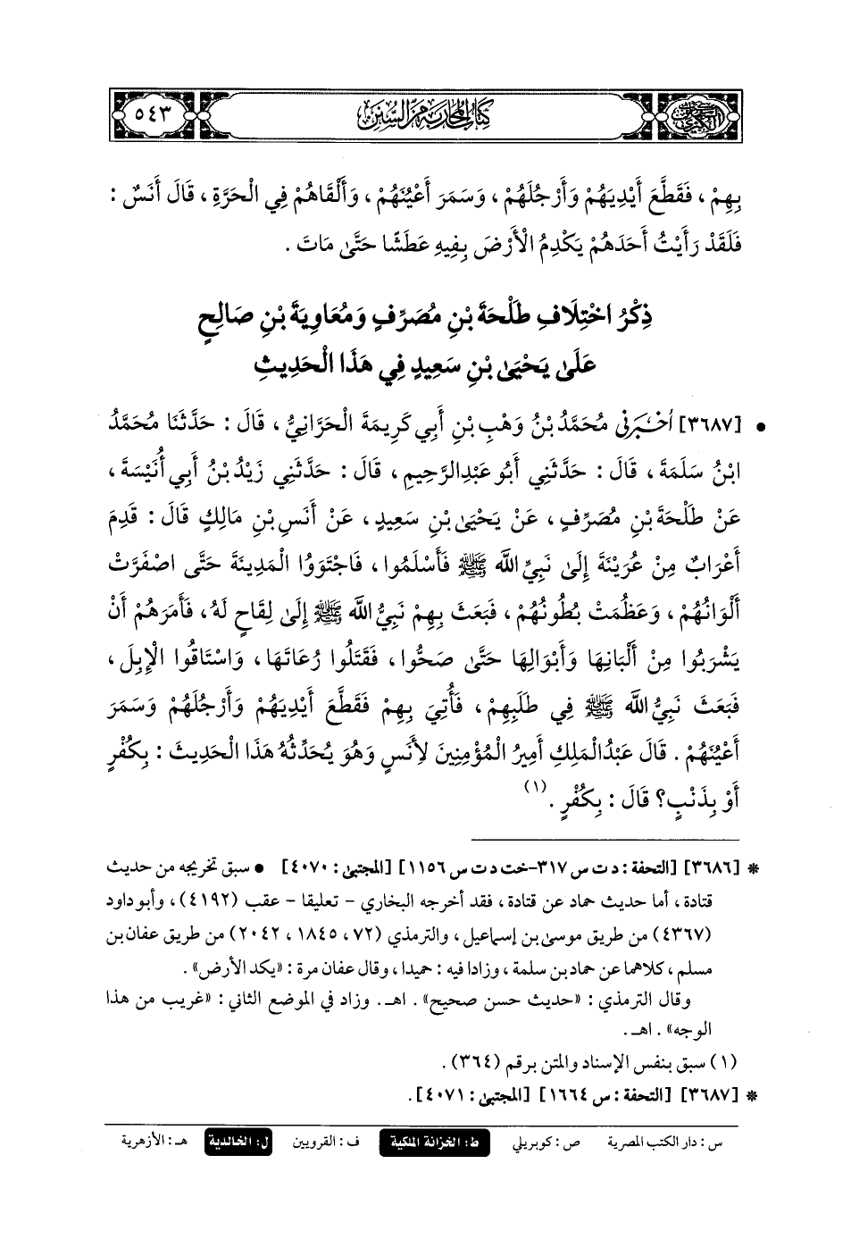3687 - أَخبَرني مُحَمدُ بنُ وَهْبِ بْنِ أَبي كَرِيمَةَ الحَرَّانِيُّ، قَالَ: حَدثنا مُحَمدُ بنُ سَلَمَةَ، قَالَ: حَدَّثَنِي أَبو عَبدِ الرَّحِيمِ، قَالَ: حَدَّثَنِي زَيْدُ بنُ أَبي أُنَيْسَةَ، عَن طَلحَةَ بْنِ مُصَرِّفٍ، عَن يَحيَى بْنِ سَعِيدٍ، عَن أَنَسِ بْنِ مَالِكٍ قَالَ: قَدِمَ أَعْرَابٌ مِنْ عُرَيْنَةَ إِلَى نَبِيِّ اللهِ صَلى الله عَليه وسَلم، فَأَسْلَمُوا فَاجْتَوَوُا المَدِينَةَ حَتَّى اصْفَرَّتْ أَلْوَانُهُمْ، وَعَظُمَتْ بُطُونُهُمْ، فَبَعَثَ بِهِمْ نَبِيُّ اللهِ صَلى الله عَليه وسَلم إِلَى لِقَاحٍ لَهُ، فَأَمَرَهُمْ أَنْ يَشْرَبُوا مِنْ أَلْبَانِهَا وَأَبْوَالِهَا حَتَّى صَحُّوا، فَقَتَلُوا رُعَاتَهَا، وَاسْتَاقُوا الإِبِلَ، فَبَعَثَ نَبِيُّ اللهِ صَلى الله عَليه وسَلم فِي طَلَبِهِمْ، فَأُتِيَ بِهِمْ، فَقَطَّعَ أَيْدِيَهُمْ وَأَرْجُلَهُمْ، وَسَمَرَ أَعْيُنَهُمْ.