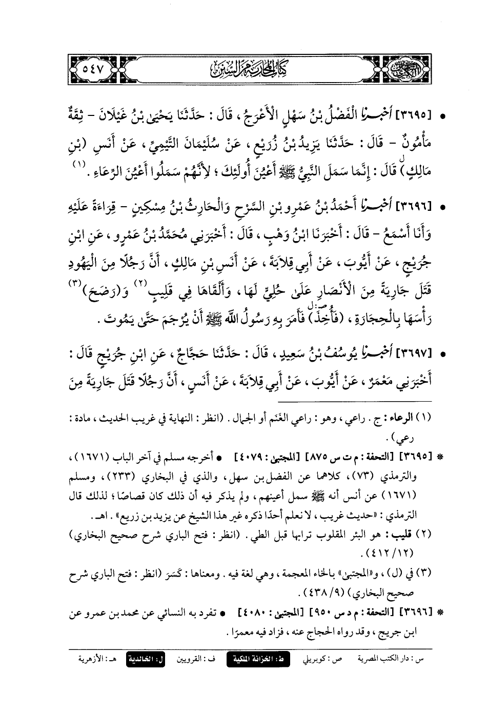 3696 - أَخبَرنا أَحْمَدُ بنُ عَمْرِو بْنِ السَّرْحِ، وَالحَارِثُ بنُ مِسْكِينٍ، قِرَاءَةً عَلَيْهِ، وَأَنَا أَسْمَعُ، قَالَ: أَخبَرنا ابنُ وَهْبٍ، قَالَ: أَخبَرني مُحَمدُ بنُ عَمْرٍو، عَنِ ابنِ جُرَيْجٍ، عَن أَيُّوبَ، عَن أَبي قِلابَةَ، عَن أَنَسِ بْنِ مَالِكٍ، أَنَّ رَجُلاً مِنَ اليَهُودِ قَتَلَ جَارِيَةً مِنَ الأَنْصَارِ عَلَى حُلِيٍّ لَهَا، وَأَلْقَاهَا فِي قَلِيبٍ، وَرَضَحَ رَأْسَهَا بِالحِجَارَةِ، فَأُخِذَ، فَأَمَرَ بِهِ رَسُولُ اللهِ صَلى الله عَليه وسَلم أَنْ يُرْجَمَ حَتَّى يَمُوتَ.