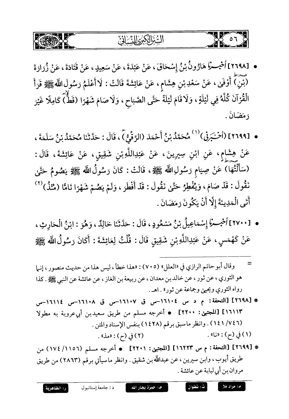 2698- أَخبَرنا هَارُونُ بنُ إِسحَاقَ، عَن عَبدَةَ، عَن سَعِيدٍ، عَن قَتَادَةَ، عَن زُرَارَةَ بْنِ أَوْفَى، عَن سَعْدِ بْنِ هِشَامٍ، عَن عَائِشَةَ قَالَتْ: لا أَعْلَمُ رَسُولَ اللهِ صَلى الله عَليه وسَلم قَرَأَ القُرْآنَ كُلَّهُ فِي لَيْلَةٍ، وَلا قَامَ لَيْلَةً حَتَّى الصَّبَّاحِ، وَلا صَامَ شَهْرًا قَطُّ كَامِلاً غَيْرَ رَمَضَانَ.
