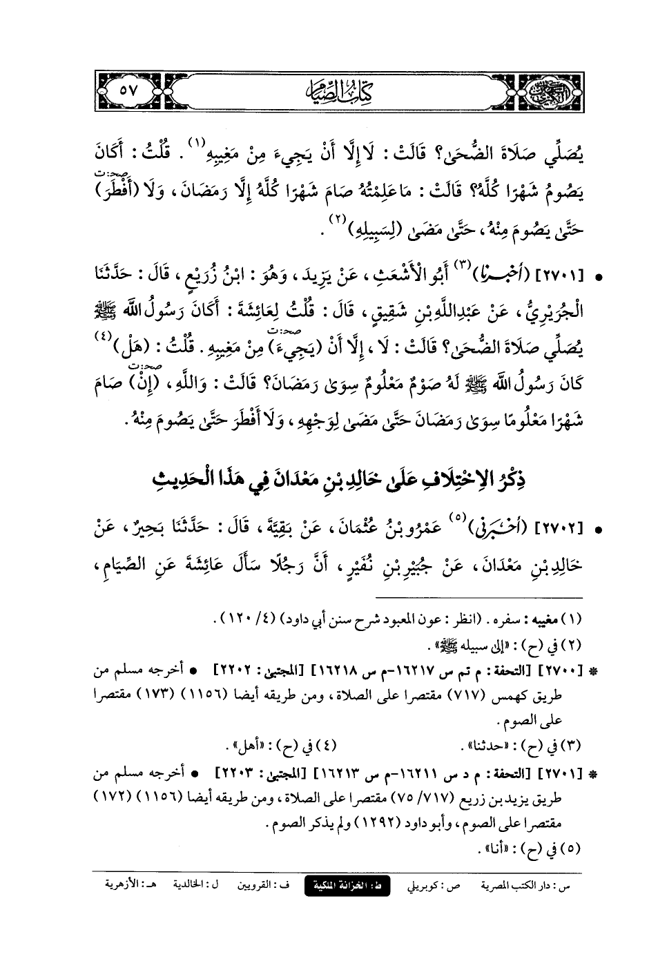 2701- أَخبَرنا أَبو الأَشْعَثِ، عَن يَزِيدَ، وَهُوَ ابنُ زُرَيْعٍ، قَالَ: حَدثنا الجُرَيْرِيُّ، عَن عَبدِ اللهِ بْنِ شَقِيقٍ قَالَ: قُلْتُ لِعَائِشَةَ: أَكَانَ رَسُولُ اللهِ صَلى الله عَليه وسَلم يُصَلِّي صَلاةَ الضُّحَى؟ قَالَتْ: لا، إِلاَّ أَنْ يَجِيءَ مِنْ مَغِيبِهِ، قُلْتُ: هَلْ كَانَ رَسُولُ اللهِ صَلى الله عَليه وسَلم لَهُ صَوْمٌ مَعْلُومٌ سِوَى رَمَضَانَ؟ قَالَتْ: وَاللهِ إِنْ صَامَ شَهْرًا مَعْلُومًا سِوَى رَمَضَانَ حَتَّى مَضَى لِوَجْهِهِ، وَلا أَفْطَرَ حَتَّى يَصُومَ مِنْهُ.