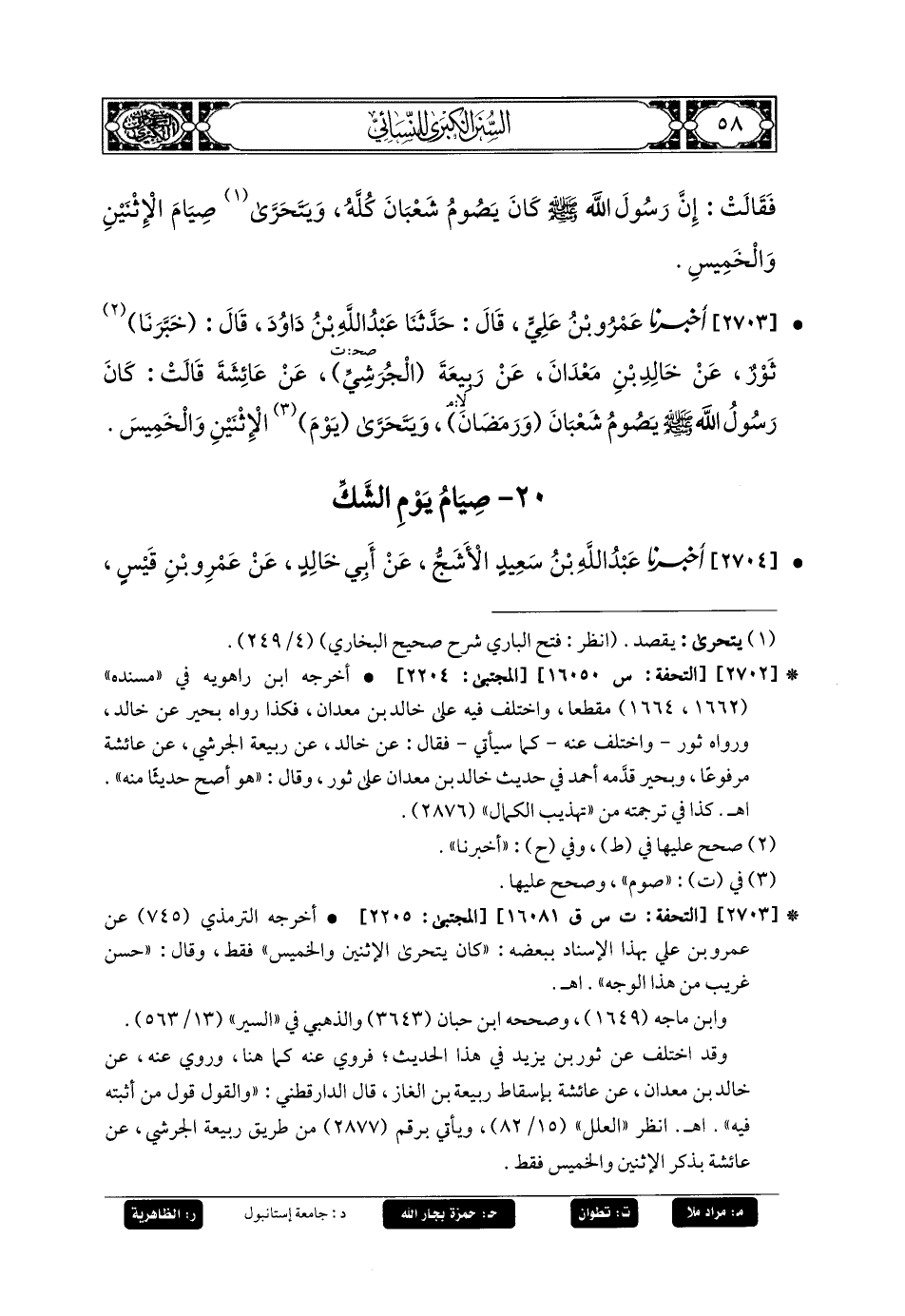 2703- أَخبَرنا عَمرُو بنُ عَليٍّ، قَالَ: حَدثنا عَبدُ اللهِ بنُ دَاوُدَ، قَالَ: خَبَّرَنَا ثَوْرٌ، عَن خَالِدِ بْنِ مَعْدَانَ، عَن رَبِيعَةَ الجُرَشِيِّ، عَن عَائِشَةَ قَالَتْ: كَانَ رَسُولُ اللهِ صَلى الله عَليه وسَلم يَصُومُ شَعْبَانَ وَرَمَضَانَ، وَيَتَحَرَّى يَوْمَ الاِثْنَيْنِ وَالخَمِيسِ.