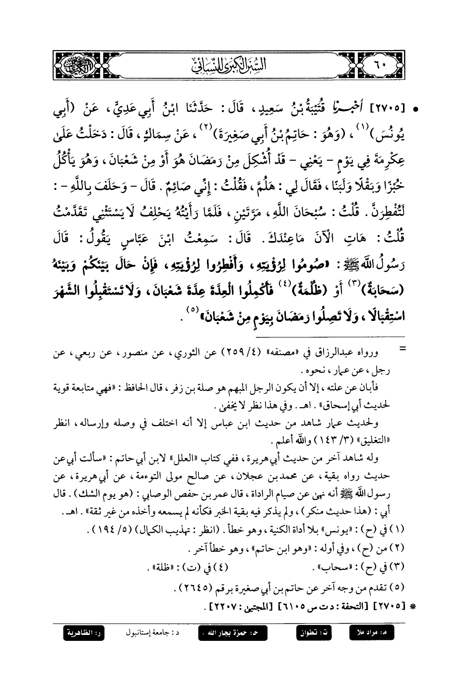 2705- أَخبَرنا قُتَيبَةُ بنُ سَعِيدٍ، قَالَ: حَدثنا ابنُ أَبي عَدِيٍّ، عَن أَبي يُونُسَ وَهُوَ حَاتِمُ بنُ أَبِي صَغِيرَةَ، عَن سِمَاكٍ قَالَ: دَخَلْتُ عَلَى عِكْرِمَةَ فِي يَوْمٍ، يَعْنِي قَدْ أَشْكَلَ مِنْ رَمَضَانَ هُوَ أَوْ مِنْ شَعْبَانَ؟ وَهُوَ يَأْكُلُ خُبْزًا وَبَقْلاً وَلَبَنًا، فَقَالَ لِي: هَلُمَّ، فَقُلْتُ: إِنِّي صَائِمٌ، قَالَ: وَحَلَفَ بِاللهِ، لَتُفْطِرَنَّ، قُلْتُ: سُبْحَانَ اللهِ، مَرَّتَيْنِ، فَلَمَّا رَأَيْتُهُ يَحْلِفُ لا يَسْتَثْنِي تَقَدَّمْتُ، قُلْتُ: هَاتِ الآنَ مَا عِنْدِكَ، قَالَ: سَمِعْتُ ابنَ عَبَّاسٍ يَقُولُ: قَالَ رَسُولُ اللهِ صَلى الله عَليه وسَلم: صُومُوا لِرُؤْيَتِهِ وَأَفْطِرُوا لِرُؤْيَتِهِ، فَإِنْ حَالَ بَيْنَكُمْ وَبَيْنَهُ سَحَابَةٌ أَوْ ظُلمَةٌ، فَأَكْمِلُوا العِدَّةَ عِدَّةَ شَعْبَانَ، وَلا تَسْتَقْبِلُوا الشَّهْرَ اسْتِقْبَالاً، وَلا تَصِلُوا رَمَضَانَ بِيَوْمٍ مِنْ شَعْبَانَ.