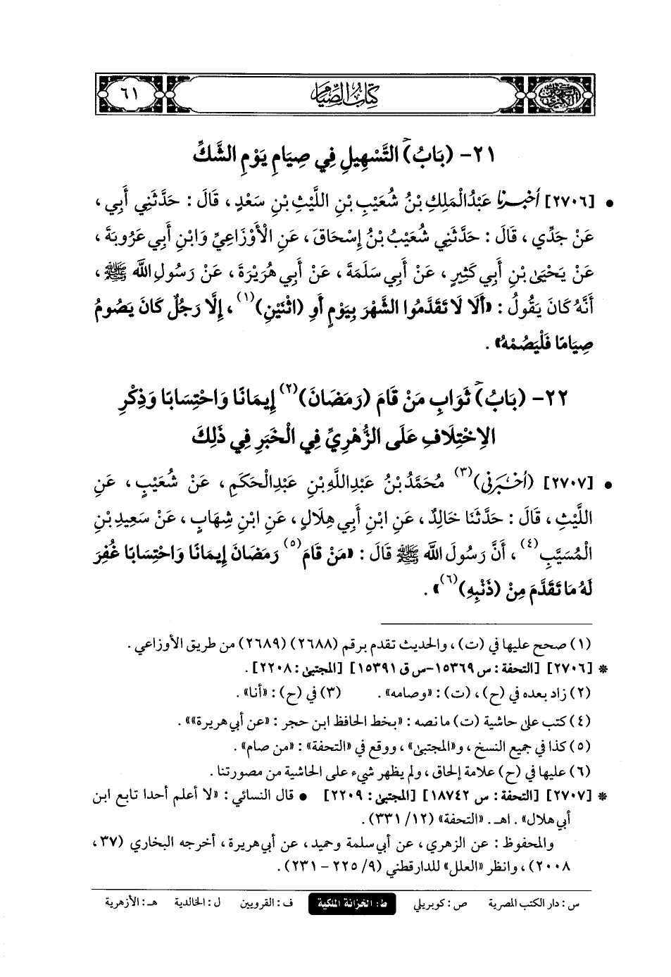 2707- أَخبَرني مُحَمدُ بنُ عَبدِ اللهِ بْنِ عَبدِ الحَكَمِ، عَن شُعَيبٍ، عَنِ اللَّيْثِ، قَالَ: حَدثنا خَالِدٌ، عَنِ ابنِ أَبي هِلالٍ، عَنِ ابنِ شِهَابٍ، عَن سَعِيدِ بْنِ المُسَيَّبِ، أَنَّ رَسُولَ اللهِ صَلى الله عَليه وسَلم قَالَ: مَنْ قَامَ رَمَضَانَ إِيمَانًا وَاحْتِسَابًا غُفِرَ لَهُ مَا تَقَدَّمَ مِنْ ذَنْبِهِ.