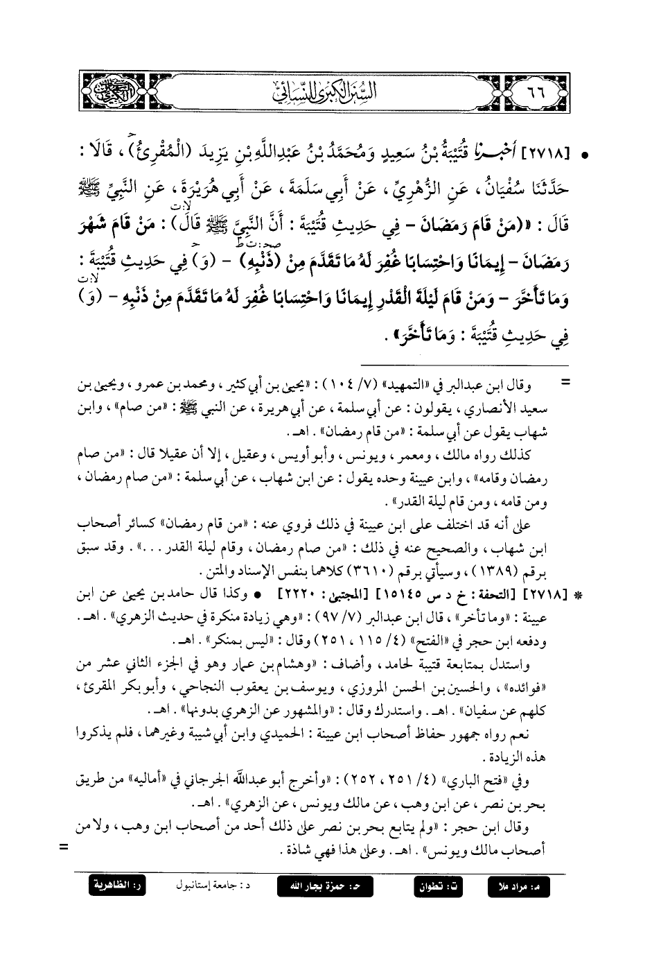 2718- أَخبَرنا قُتَيبَةُ بنُ سَعِيدٍ، وَمُحَمدُ بنُ عَبدِ اللهِ بْنِ يَزِيدَ المُقْرِئُ، قَالا: حَدثنا سُفْيَانُ، عَنِ الزُّهْرِيِّ، عَن أَبي سَلَمَةَ، عَن أَبي هُرَيرَةَ، عَنِ النَّبِيِّ صَلى الله عَليه وسَلم قَالَ: مَنْ قَامَ رَمَضَانَ، فِي حَدِيثِ قُتَيْبَةَ: أَنَّ النَّبِيَّ صَلَّى اللهُ عَلَيْه وَسَلَّمَ قال: مَنْ قَامَ شهر رَمَضَانَ إِيمَانًا وَاحْتِسَابًا، غُفِرَ لَهُ مَا تَقَدَّمَ مِنْ ذَنْبِهِ، وفِي حَدِيثِ قُتَيْبَةَ: وَمَا تَأَخَّرَ، وَمَنْ قَامَ لَيْلَةَ القَدْرِ إِيمَانًا وَاحْتِسَابًا، غُفِرَ لَهُ مَا تَقَدَّمَ مِنْ ذَنْبِهِ، وفِي حَدِيثِ قُتَيْبَةَ: وَمَا تَأَخَّرَ.