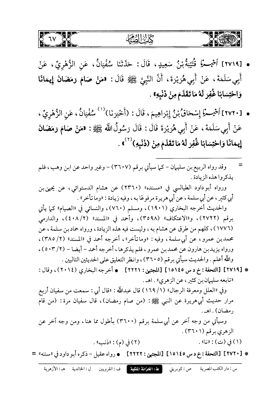 2719- أَخبَرنا قُتَيبَةُ بنُ سَعِيدٍ، قَالَ: حَدثنا سُفْيَانُ، عَنِ الزُّهْرِيِّ، عَن أَبي سَلَمَةَ، عَن أَبي هُرَيرَةَ، أَنَّ النَّبِيَّ صَلى الله عَليه وسَلم قَالَ: مَنْ صامَ رَمَضَانَ إِيمَانًا وَاحْتِسَابًا غُفِرَ لَهُ مَا تَقَدَّمَ مِنْ ذَنْبِهِ.
