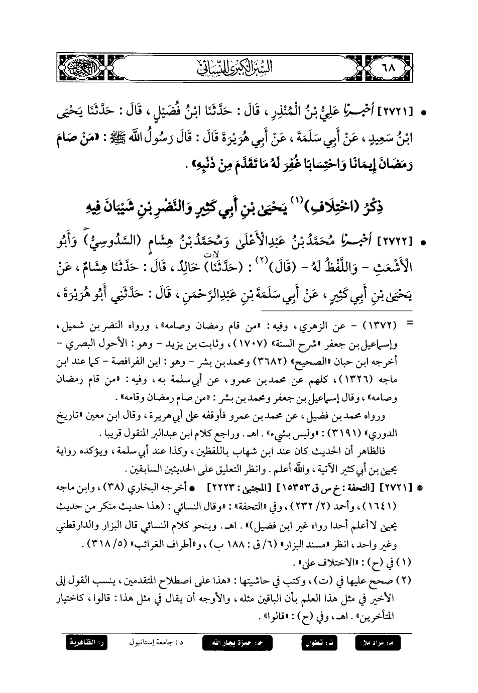 2722- أَخبَرنا مُحَمدُ بنُ عَبدِ الأَعْلَى، وَمُحَمدُ بنُ هِشَامٍ السَّدُوسِيُّ، وَأَبو الأَشْعَثِ، وَاللَّفْظُ لَهُ، قَالَ: حَدثنا خَالِدٌ، قَالَ: حَدثنا هِشَامٌ، عَن يَحيَى بْنِ أَبي كَثِيرٍ، عَن أَبي سَلَمَةَ بْنِ عَبدِ الرَّحْمَنِ، قَالَ: حَدَّثَنِي أَبو هُرَيرَةَ، أَنَّ رَسُولَ اللهِ صَلى الله عَليه وسَلم قَالَ: مَنْ قَامَ رَمَضَانَ إِيمَانًا وَاحْتِسَابًا غُفِرَ لَهُ مَا تَقَدَّمَ مِنْ ذَنْبِهِ، وَمَنْ قَامَ لَيْلَةَ القَدْرِ إِيمَانًا وَاحْتِسَابًا غُفِرَ لَهُ مَا تَقَدَّمَ مِنْ ذَنْبِهِ.
