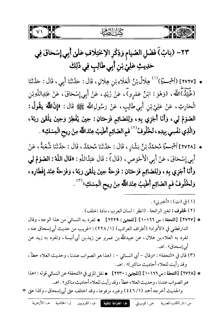2727- أَخبَرنا هِلالُ بنُ العَلاءِ بْنِ هِلالٍ، قَالَ: حَدثنا أَبي، قَالَ: حَدثنا عُبَيدُ اللهِ وَهُوَ ابنُ عَمْرٍو، عَن زَيْدٍ، عَن أَبي إِسحَاقَ، عَن عَبدِ اللهِ بْنِ الحَارِثِ، عَن عَليِّ بْنِ أَبي طَالِبٍ، عَن رَسُولِ اللهِ صَلى الله عَليه وسَلم قَالَ: إِنَّ اللهَ يَقُولُ: الصَّوْمُ لِي وَأَنَا أَجْزِي بِهِ، وَلِلصَّائِمِ فَرْحَتَانِ: حِينَ يُفْطِرُ، وَحِينَ يَلْقَى رَبَّهُ، وَالَّذِي نَفْسِي بِيَدِهِ، لَخُلُوفُ فَمِ الصَّائِمِ أَطْيَبُ عِنْدَ اللهِ مِنْ رِيحِ المِسْكِ.