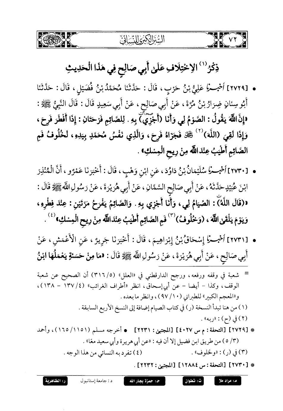 2729- أَخبَرنا عَليُّ بنُ حَرْبٍ، قَالَ: حَدثنا مُحَمدُ بنُ فُضَيْلٍ، قَالَ: حَدثنا أَبو سِنَانٍ ضِرَارُ بنُ مُرَّةَ، عَن أَبي صَالِحٍ، عَن أَبي سَعِيدٍ قَالَ: قَالَ النَّبِيُّ صَلى الله عَليه وسَلم: إِنَّ اللهَ يَقُولُ: الصَّوْمُ لِي وَأَنَا أَجْزِي بِهِ، لِلصَّائِمِ فَرْحَتَانِ: إِذَا أَفْطَرَ فَرِحَ، وَإِذَا لَقِيَ اللهَ عزَّ وجلَّ فَجَزَاهُ فَرِحَ، وَالَّذِي نَفْسُ مُحَمدٍ بِيَدِهِ، لَخُلُوفُ فَمِ الصَّائِمِ أَطْيَبُ عِنْدَ اللهِ مِنْ رِيحِ المِسْكِ.