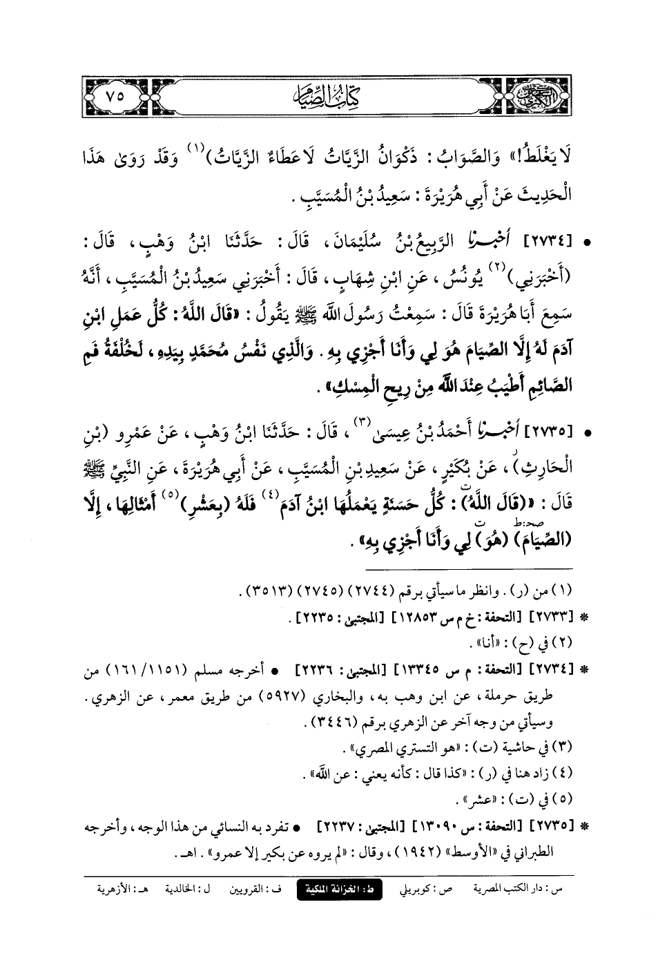 2735- أَخبَرنا أَحْمَدُ بنُ عِيسَى، قَالَ: حَدثنا ابنُ وَهْبٍ، عَن عَمْرِو بْنِ الحَارِثِ، عَن بُكَيْرٍ، عَن سَعِيدِ بْنِ المُسَيَّبِ، عَن أَبي هُرَيرَةَ، عَنِ النَّبِيِّ صَلى الله عَليه وسَلم قَالَ: قَالَ اللهُ: كُلُّ حَسَنَةٍ يَعْمَلُهَا ابنُ آدَمَ فَلَهُ بِعَشْرِ أَمْثَالِهَا، إِلاَّ الصِّيَامَ هُوَ لِي وَأَنَا أَجْزِي بِهِ.