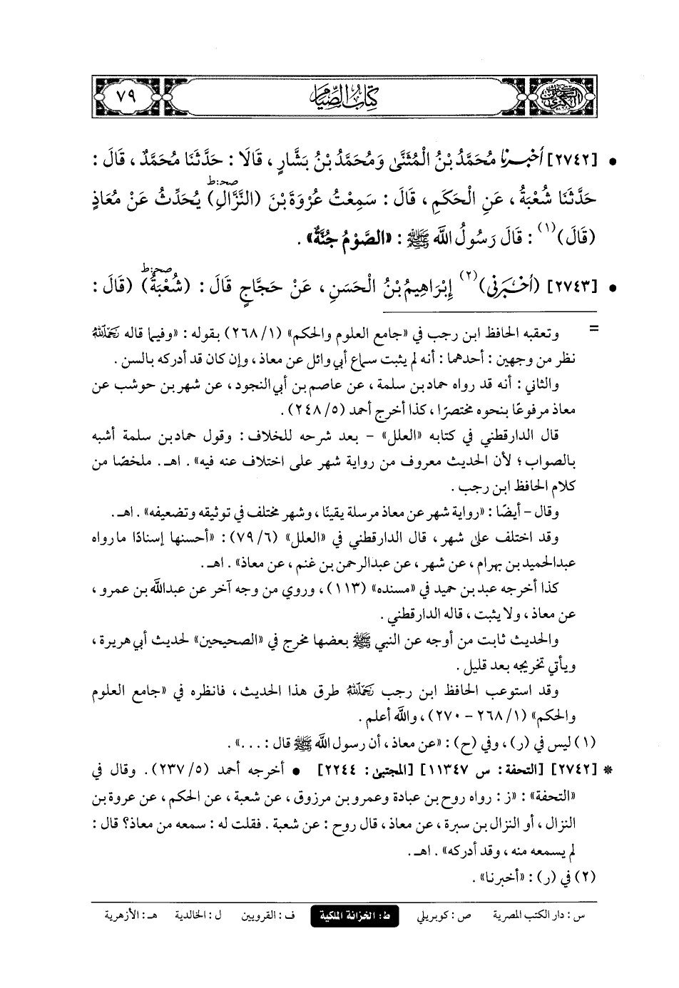 2742- أَخبَرنا مُحَمدُ بنُ المُثَنَّى، وَمُحَمدُ بنُ بَشَّارٍ، قَالا: حَدثنا مُحَمدٌ، قَالَ: حَدثنا شُعبَةُ، عَنِ الحَكَمِ، قَالَ: سَمِعْتُ عُرْوَةَ بْنَ النَّزَّالِ يُحَدِّثُ عَن مُعَاذٍ، قَالَ: قَالَ رَسُولُ اللهِ صَلى الله عَليه وسَلم: الصَّوْمُ جُنَّةٌ.