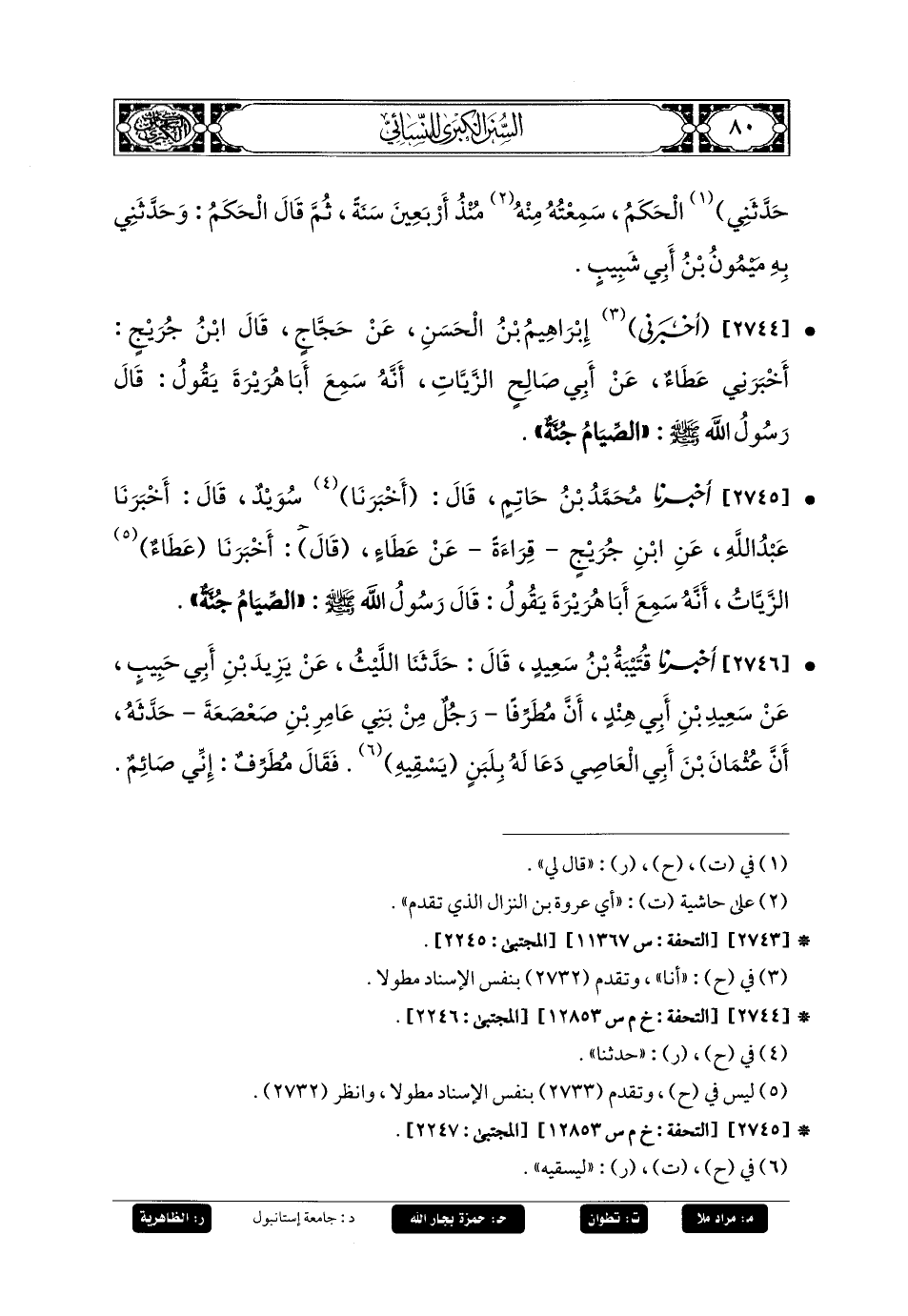 2745- أَخبَرنا مُحَمدُ بنُ حَاتِمٍ، قَالَ: أَخبَرنا سُوَيْدٌ، قَالَ: أَخبَرنا عَبدُ اللهِ، عَنِ ابنِ جُرَيْجٍ، قِرَاءَةً عَن عَطَاءٍ، قَالَ أَخبَرنا عَطَاءٌ الزَّيَّاتُ، أَنَّهُ سَمِعَ أَبَا هُرَيرَةَ، يَقُولُ: قَالَ رَسُولُ اللهِ صَلى الله عَليه وسَلم: الصِّيَامُ جُنَّةٌ.