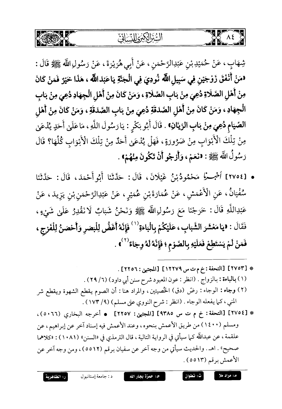 2754- أَخبَرنا مَحْمُودُ بنُ غَيْلانَ، قَالَ: حَدثنا أَبو أَحْمَدَ، قَالَ: حَدثنا سُفْيَانُ، عَنِ الأَعْمَشِ، عَن عُمَارَةَ بْنِ عُمَيْرٍ، عَن عَبدِ الرَّحْمَنِ بْنِ يَزِيدَ، عَن عَبدِ اللهِ، قَالَ: خَرَجْنَا مَعَ رَسُولِ اللهِ صَلى الله عَليه وسَلم وَنَحْنُ شَبَابٌ لا نَقْدِرُ عَلَى شَيْءٍ، فَقَالَ: يَا مَعْشَرَ الشَّبَابِ، عَلَيْكُمْ بِالبَاءَةِ، فَإِنَّهُ أَغَضُّ لِلْبَصَرِ، وَأَحْصَنُ لِلْفَرْجِ، فَمَنْ لَمْ يَسْتَطِعْ فَعَلَيْهِ بِالصَّوْمِ فَإِنَّهُ لَهُ وِجَاءٌ.