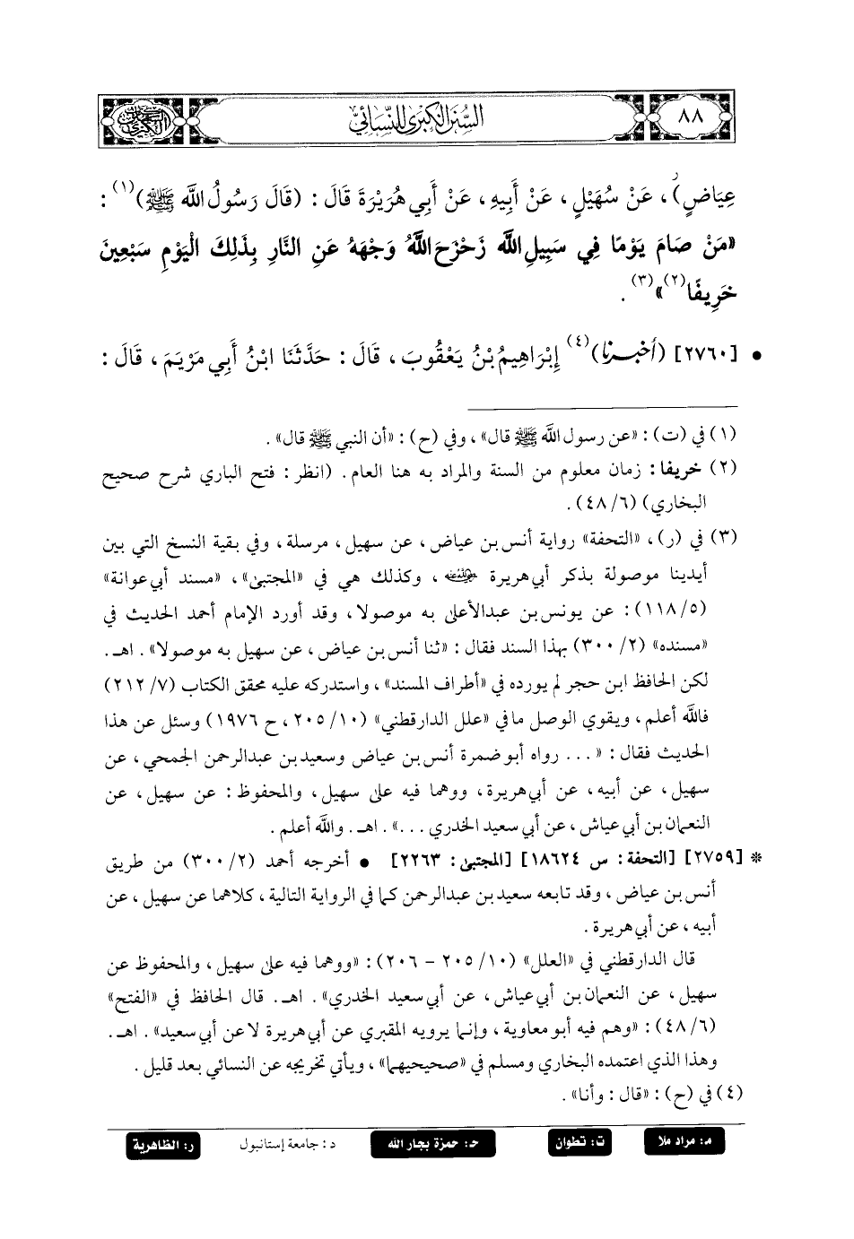 2760- أَخبَرنا إِبرَاهِيمُ بنُ يَعقُوبَ، قَالَ: حَدثنا ابنُ أَبي مَرْيَمَ، قَالَ: أَخبَرنا سَعِيدُ بنُ عَبدِ الرَّحْمَنِ، قَالَ: حَدَّثَنِي سُهَيلُ بنُ أَبي صَالِحٍ، عَن أَبيهِ، عَن أَبي هُرَيرَةَ، قَالَ: قَالَ رَسُولُ اللهِ صَلى الله عَليه وسَلم: مَنْ صَامَ يَوْمًا فِي سَبِيلِ اللهِ، بَاعَدَ اللهُ وَجْهَهُ عَنِ النَّارِ بِذَلِكَ اليَوْمِ سَبْعِينَ خَرِيفًا.