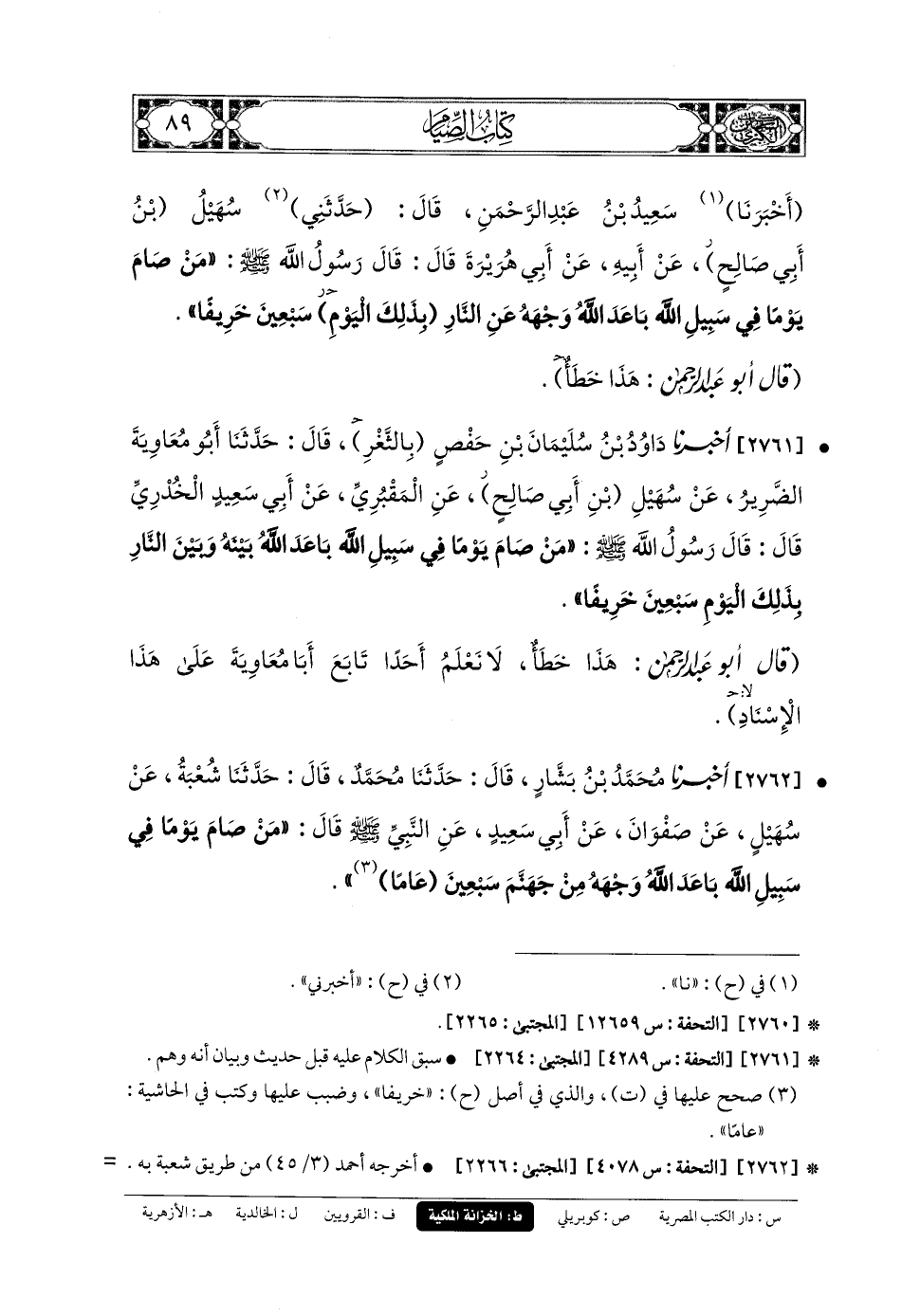 2761- أَخبَرنا دَاوُدُ بنُ سُلَيمَانَ بْنِ حَفْصٍ بِالثَّغْرِ، قَالَ: حَدثنا أَبو مُعاويَةَ الضَّرِيرُ، عَن سُهَيلِ بْنِ أَبي صَالِحٍ، عَنِ المَقْبُرِيِّ، عَن أَبي سَعِيدٍ الخُدْرِيِّ، قَالَ: قَالَ رَسُولُ اللهِ صَلى الله عَليه وسَلم: مَنْ صَامَ يَوْمًا فِي سَبِيلِ اللهِ، بَاعَدَ اللهُ بَيْنَهُ وَبَيْنَ النَّارِ بِذَلِكَ اليَوْمِ سَبْعِينَ خَرِيفًا.