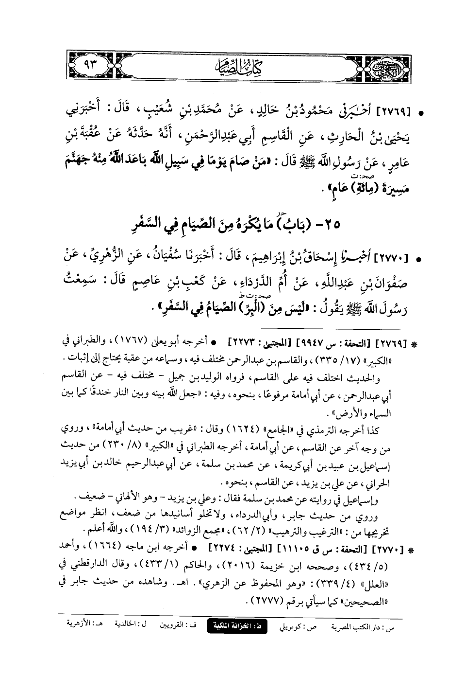 2769- أَخبَرني مَحْمُودُ بنُ خَالِدٍ، عَن مُحَمدِ بْنِ شُعَيبٍ، قَالَ: أَخبَرني يَحيَى بنُ الحَارِثِ، عَنِ القَاسِمِ أَبي عَبدِ الرَّحْمَنِ، أَنَّهُ حَدَّثَهُ عَن عُقْبَةَ بْنِ عَامِرٍ، عَن رَسُولِ اللهِ صَلى الله عَليه وسَلم قَالَ: مَنْ صَامَ يَوْمًا فِي سَبِيلِ اللهِ، بَاعَدَ اللهُ مِنْهُ جَهَنَّمَ مَسِيرَةَ مِئَةِ عَامٍ.