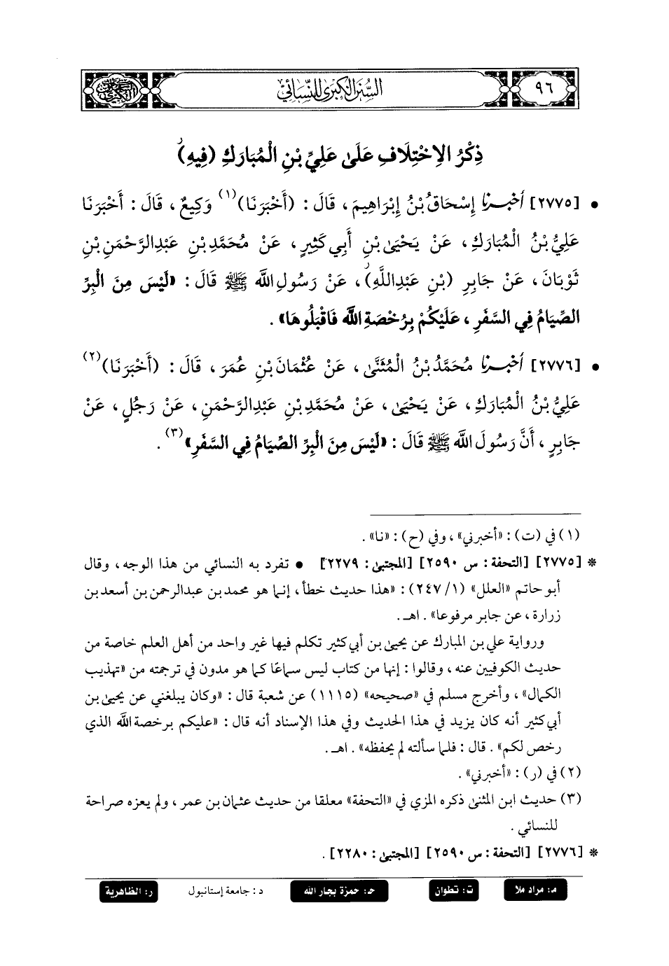 2775- أَخبَرنا إِسحَاقُ بنُ إِبرَاهِيمَ، قَالَ: أَخبَرنا وَكِيعٌ، قَالَ: أَخبَرنا عَليُّ بنُ المُبَارَكِ، عَن يَحيَى بْنِ أَبي كَثِيرٍ، عَن مُحَمدِ بْنِ عَبدِ الرَّحْمَنِ بْنِ ثَوْبَانَ، عَن جَابِرِ بْنِ عَبدِ اللهِ، عَن رَسُولِ اللهِ صَلى الله عَليه وسَلم قَالَ: لَيْسَ مِنَ البِرِّ الصِّيَامُ فِي السَّفَرِ، عَلَيْكُمْ بِرُخْصَةِ اللهِ فَاقْبَلُوهَا.