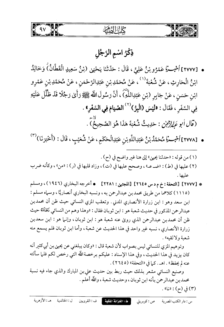 2777- أَخبَرنا عَمرُو بنُ عَليٍّ، قَالَ: حَدثنا يَحيَى بنُ سَعِيدٍ القَطَّانُ، وَخَالِدُ بنُ الحَارِثِ، عَن شُعبَةَ، عَن مُحَمدِ بْنِ عَبدِ الرَّحْمَنِ، عَن مُحَمدِ بْنِ عَمْرِو بْنِ حَسَنٍ، عَن جَابِرِ بْنِ عَبدِ اللهِ، أَنَّ رَسُولَ اللهِ صَلى الله عَليه وسَلم رَأَى رَجُلاً قَدْ ظُلِّلَ عَلَيْهِ فِي السَّفَرِ، فَقَالَ: لَيْسَ البِرُّ الصِّيَامُ فِي السَّفَرِ.