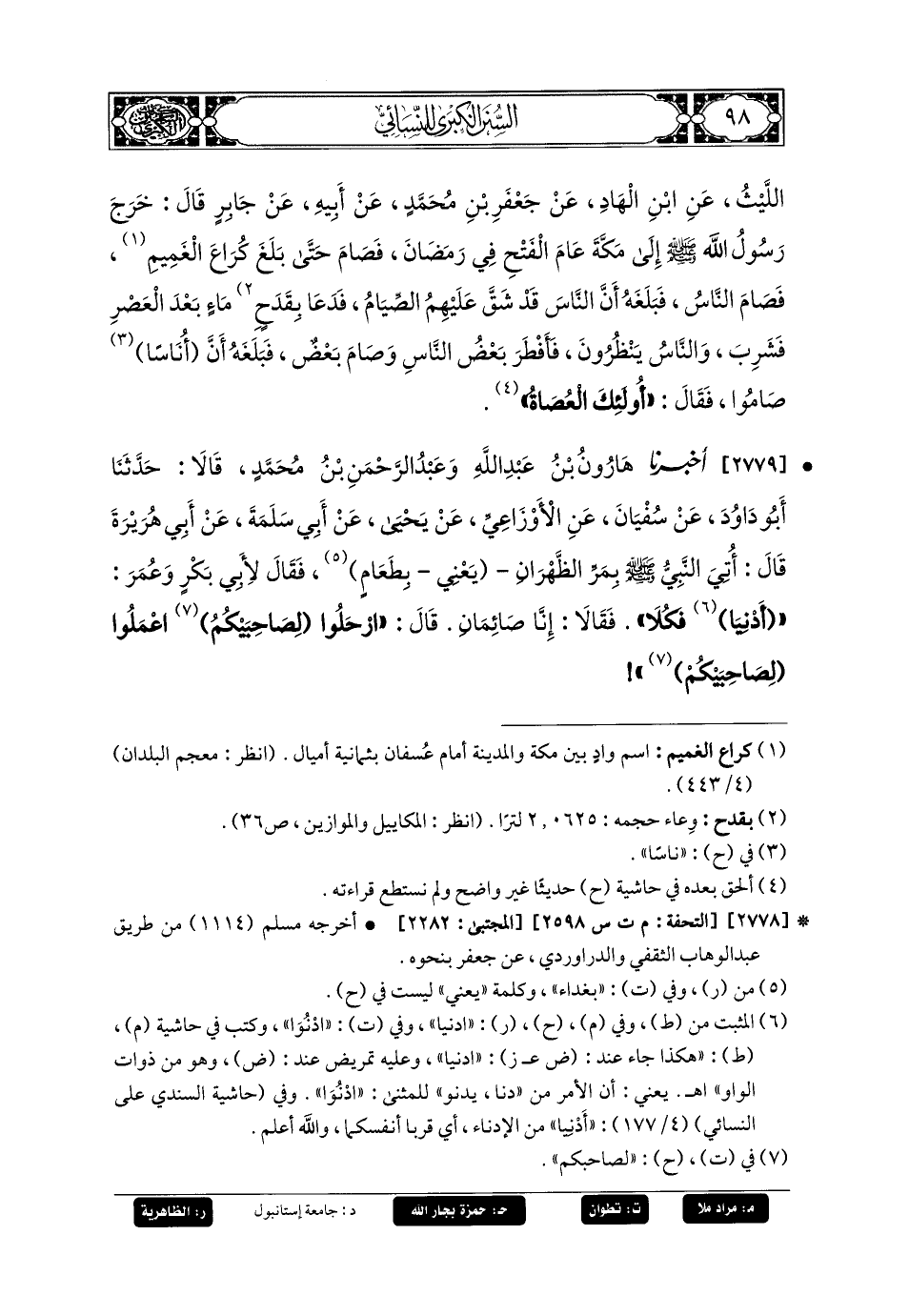 2779- أَخبَرنا هَارُونُ بنُ عَبدِ اللهِ، وَعَبدُ الرَّحْمَنِ بنُ مُحَمدٍ، قَالا: حَدثنا أَبو دَاوُدَ، عَن سُفْيَانَ، عَنِ الأَوْزَاعِيِّ، عَن يَحيَى، وَهُوَ ابنُ أَبي كَثِيرٍ، عَن أَبي سَلَمَةَ، عَن أَبي هُرَيرَةَ، قَالَ: أُتِيَ النَّبِيُّ صَلى الله عَليه وسَلم بِمَرِّ الظَّهْرَانِ، يَعْنِي بِطَعَامٍ، فَقَالَ لأَبي بَكْرٍ وَعُمَرَ: أَدْنِيَا فَكُلا، فَقَالا: إِنَّا صَائِمَانِ، قَالَ: ارْحَلُوا لِصَاحِبَيْكُمِ اعْمَلُوا لِصَاحِبَيْكُمْ.