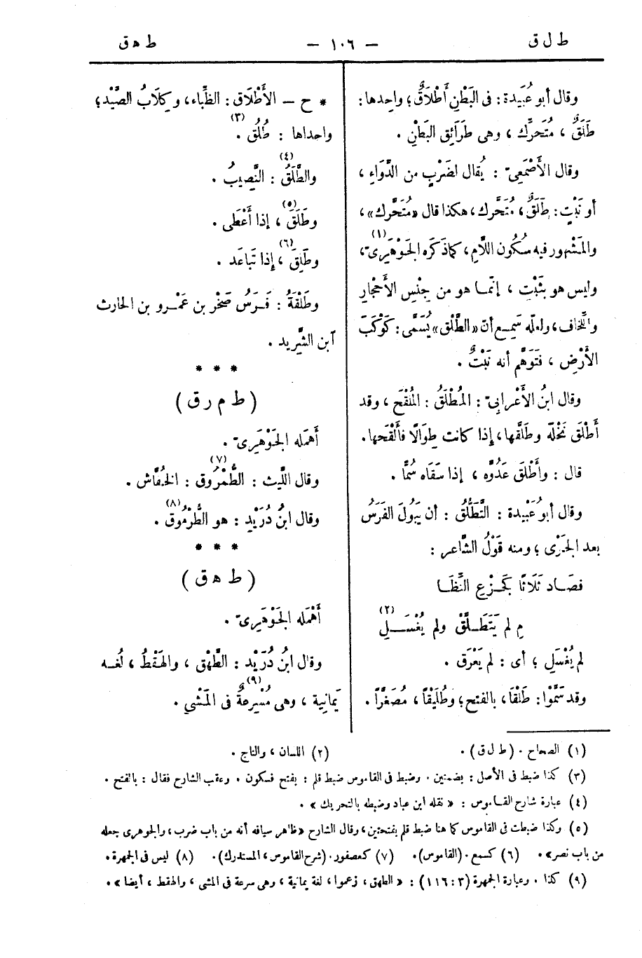 * ح - الأَطْلاقُ: الظِّبَاءُ، وكِلابُ الصَّيْدِ؛ واحِدُها: طُلُقٌ.