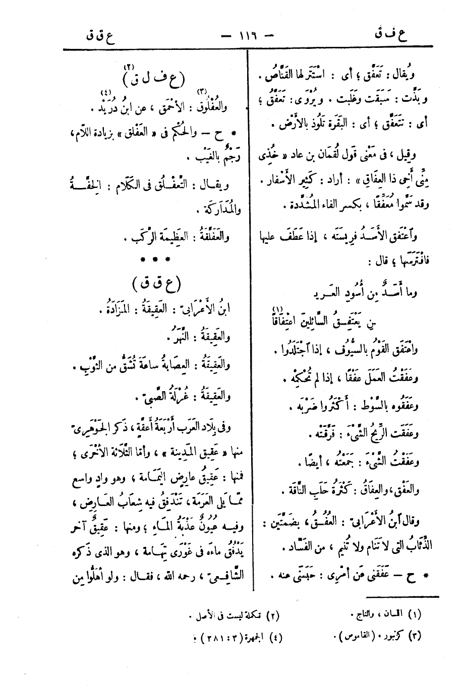 وقال ابنُ الأعرابيِّ: العُفُقُ، بضمتين: الذِّئَابُ التي لا تَنَاُم ولا تُنِيمُ، من الفَسادِ.