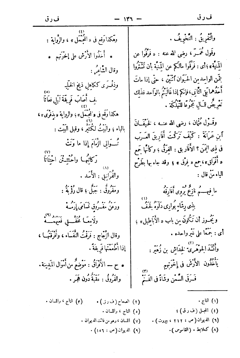 وقَوْلُ عُثْمَانَ، رضي الله عنه، لِخَيْفَانَ بنِ عَرَانَةَ: كَيْفَ تَرَكْتَ أَفَارِيقَ العَرَبِ في ذِي اليَمَنِ؟ الأَفَارِيقُ: الفِرَقُ؛ وكأنَّها جَمعُ " أَفْرَاقٍ "، جمع " فِرْقٍ "؛ وقد جاءَ بها بطَرْحِ الياءِ مَنْ قالَ: