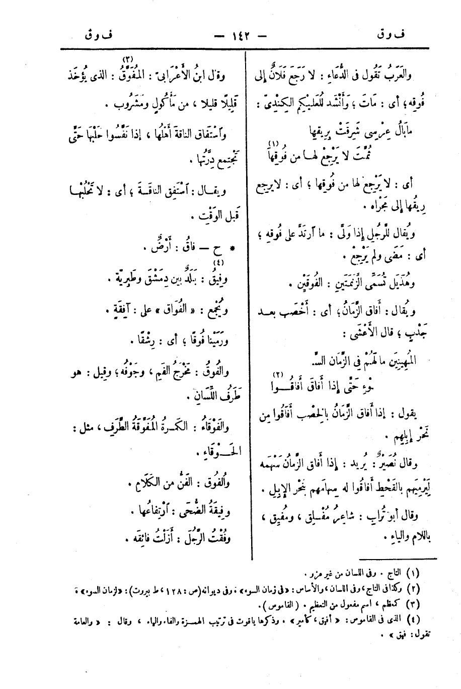 والعَرَبُ تَقُولُ في الدُّعَاءِ: لا رَجَعَ فُلانٌ إلى فُوقِه؛ أي: مَاتَ؛ وأنشدَ لِلْعُلَيْكِمِ الكِنْدِيِّ: