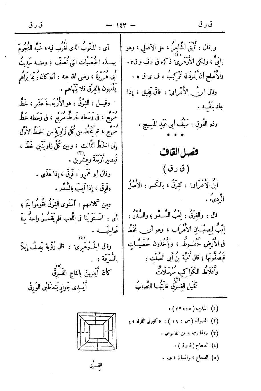 وقيل: القِرْقُ: هو الأَرْبَعَةَ عَشَرَ، خَطٌّ مُرَبَّعٌ، في وَسَطِه خَطٌّ مُرَبَّعٌ، في وَسَطِه خَطٌّ مُرَبَّعٌ، ثُمَّ يُخَطُّ مِن كُلِّ زَاوِيَةٍ من الخَطِّ الأَوَّلِ إلى الخَطِّ الثَّالِثِ، وبَيْنَ كُلِّ زَاوِيَتَيْنِ خَطٌّ، فيَصيرُ أَرْبَعَةً وعِشْرينَ.