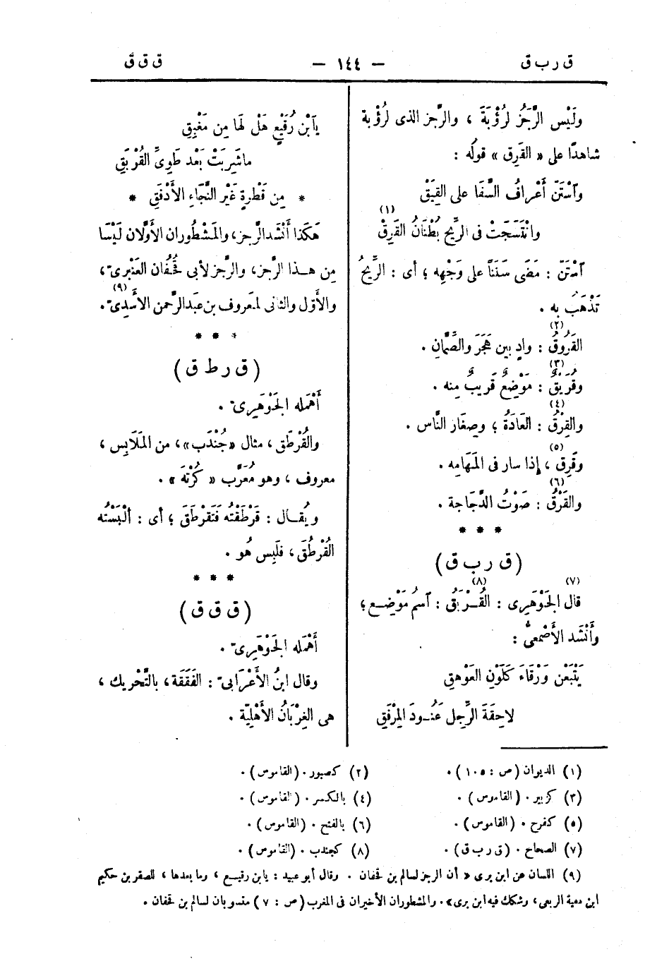 هكذا أنشدَ الرَّجَزَ، والمَشْطُورانِ الأَوَّلانِ لَيْسَا مِن هذا الرَّجَزِ، والرَّجَزُ لأبي قُحْفانَ العَنْبَرِيِّ، والأَوَّلُ والثاني لِمَعُروفِ بنِ عبدِ الرحمنِ الأَسَدِيِّ.