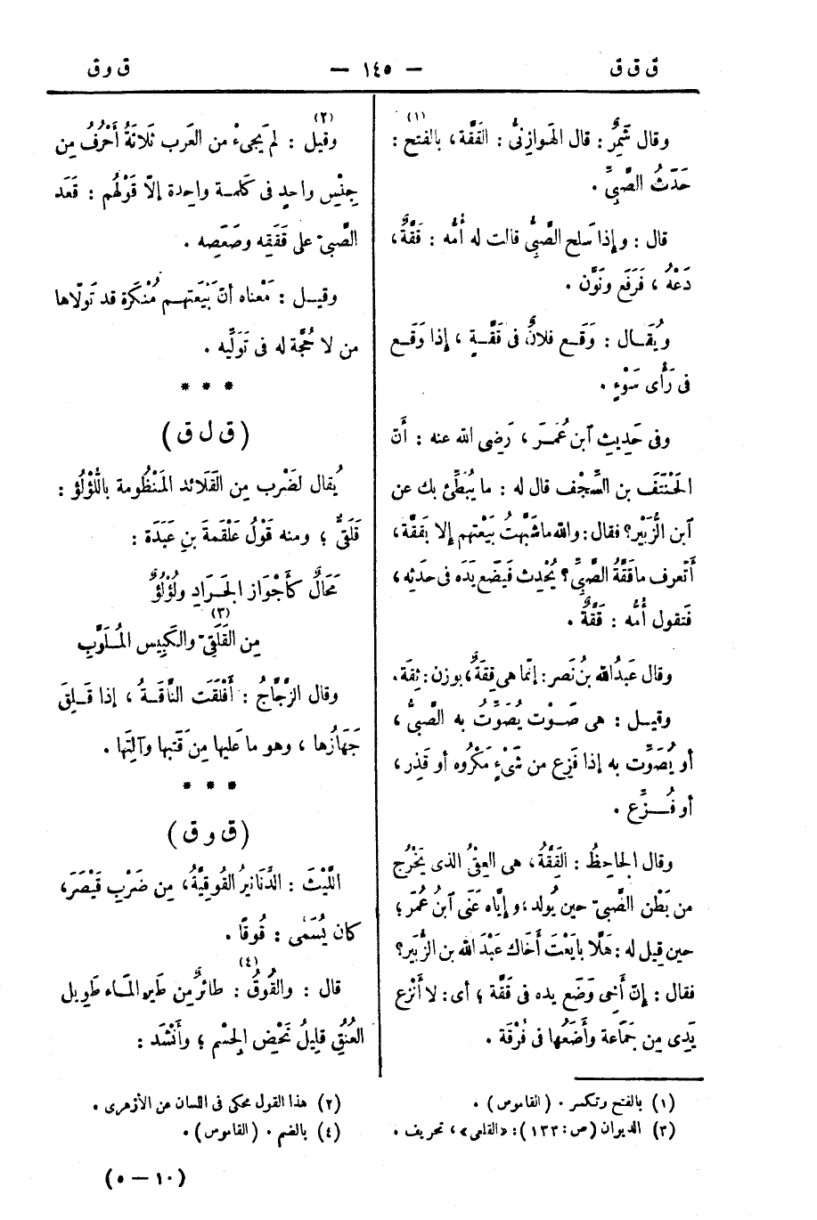وقال الجاحِظُ: القَقَّةُ هي العِقْيُ الذي يَخْرُجُ من بَطْنِ الصَّبِيِّ حينَ يُولَدُ، وإيَّاه عَنَى ابنُ عُمَرَ؛ حِينَ قِيلَ له: هَلَّا بايَعْتَ أَخَاكَ عَبْدَ اللهِ بنَ الزُّبَيْرِ؟ فقال: إنَّ أخِي وَضَعَ يَدَه في قَقَّةٍ؛ أي: لا أَنْزِعُ يَدِي مِن جَمَاعةٍ وأَضَعُها في فُرْقَةٍ.