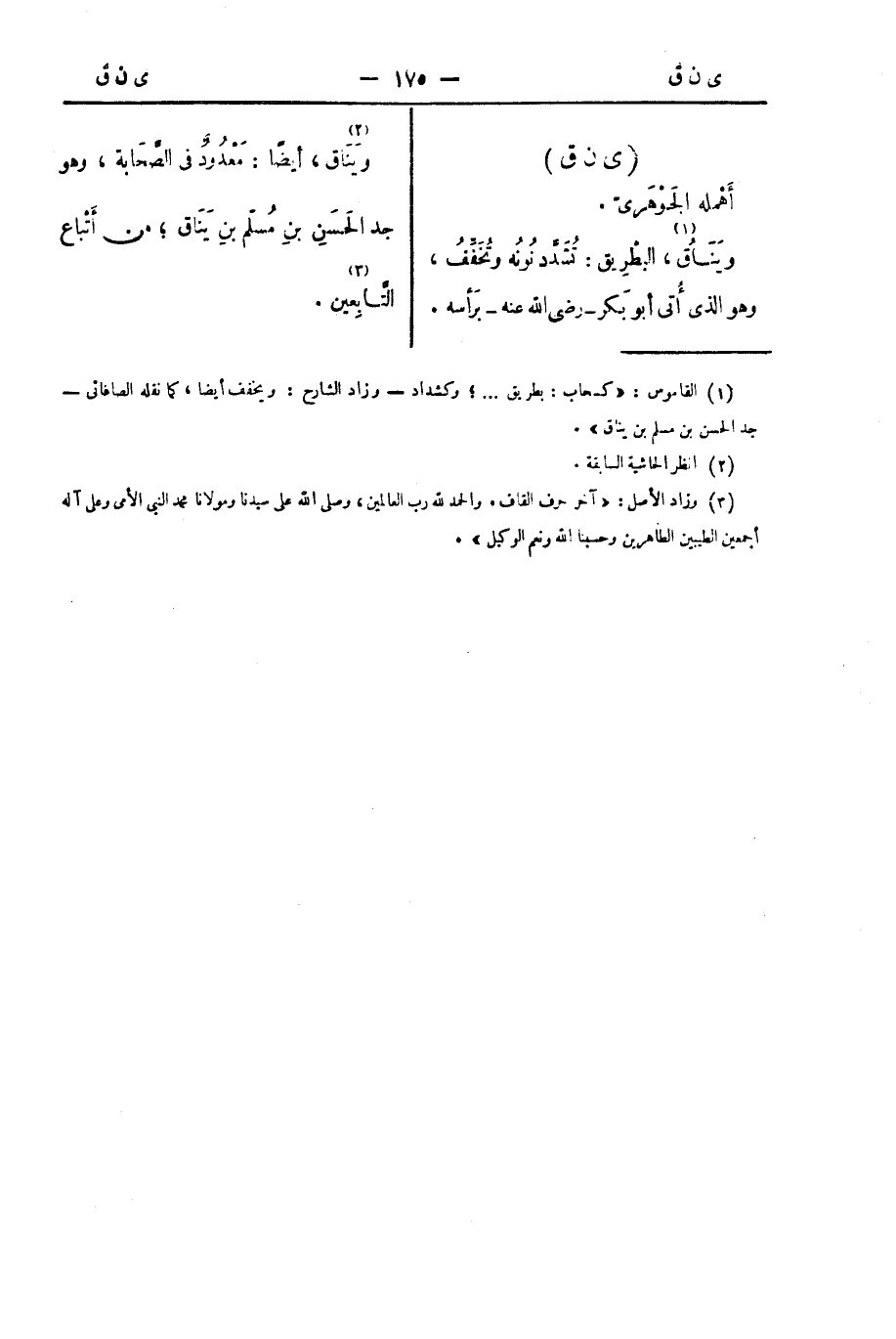 ويَنَاقُ، البِطْرِيقُ: تُشَدَّدُ نُونُه وتُخَفَّفُ، وهو الذي أُتِيَ أبو بَكْرٍ، رضي الله عنه، برَأْسِه.