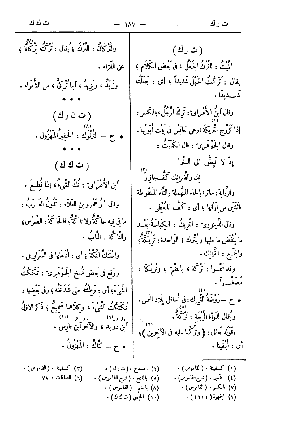 والتِّرْكَانُ: التَّرْكُ؛ يُقالُ: تَرَكْتُه تِرْكَانًا؛ عن الفَرّاءِ.