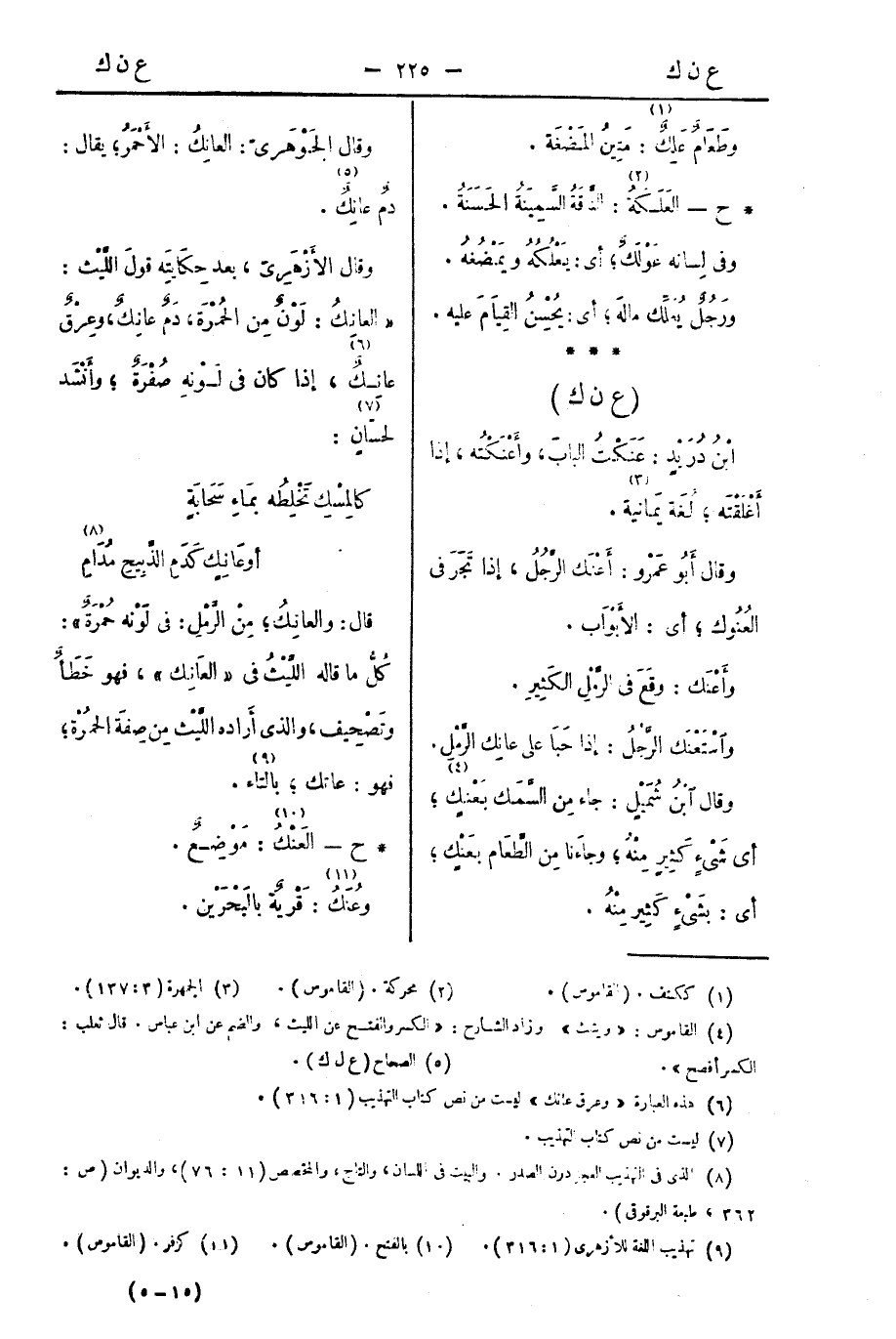قال: والعَانِكُ؛ مِنَ الرَّمْلِ: في لَوْنِه حُمْرَةٌ ": كُلُّ مَا قالَه اللَّيْثُ في " العَانِكِ "، فهو خَطَأٌ وتَصْحِيفٌ، والذي أَرَادَه اللَّيْثُ مِن صِفَةِ الحُمْرَةِ؛ فهو: عَاتِك؛ بالتَّاءِ.