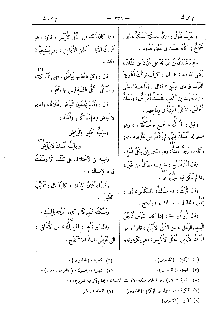 وقيل: المُسَكُ، جَمْعُ " مُسَكَة "، وهو الذي إذا أَمْسَكَ بشَيْءٍ لم يُقْدَرْ على تَخْلِيصِه منه؛ ونَظِيرُه: رَجُلٌ أُمَنَةٌ، وهو الذي يَثِقُ بكُلِّ أَحَدٍ.