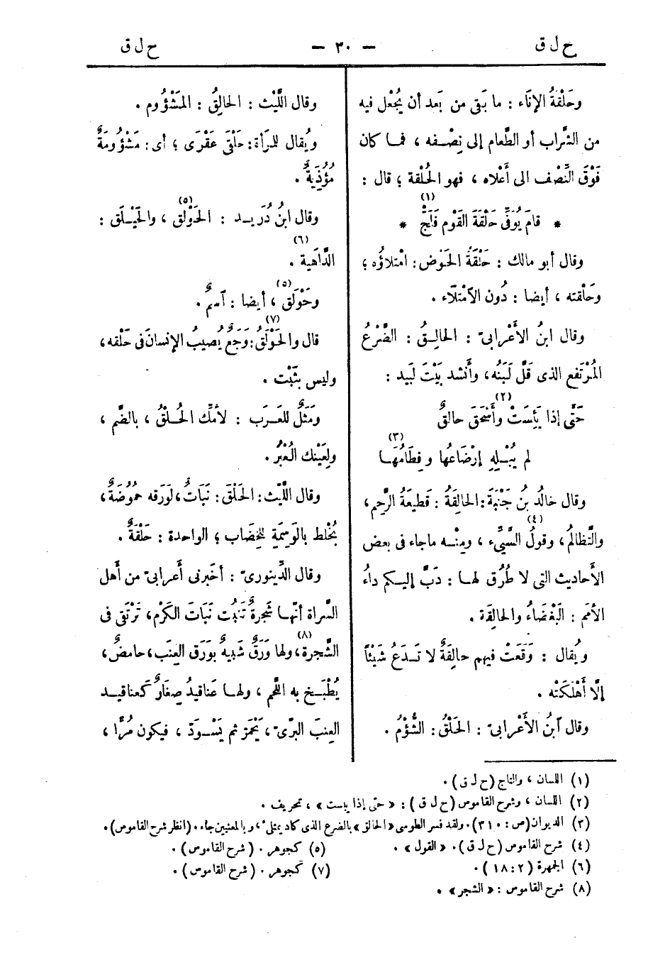 وقال أبو مالك: حَلْقَةُ الحَوْضِ: امْتِلاؤُه؛ وحَلْقَتُه، أيضًا: دُونَ الامْتِلاءِ.