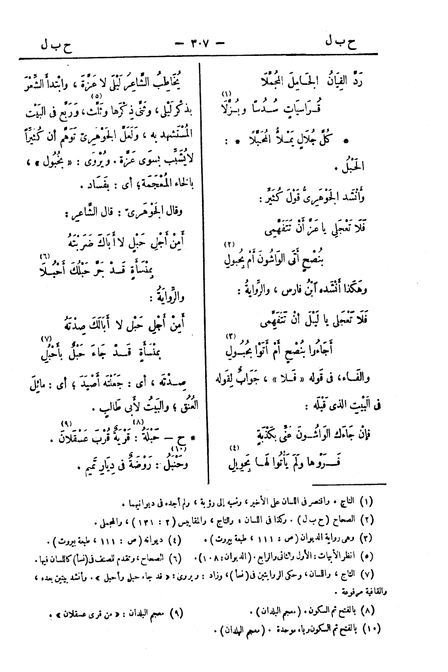 يُخَاطِبُ الشَّاعِرُ لَيْلَى لا عَزَّةَ، وابْتَدَأَ الشِّعْرَ بذِكْرِ لَيْلَى، وثَنَّى ذِكْرَها وثَلَّثَ، ورَبَّعَ في البَيْتِ المُسْتَشْهَدِ بِه، ولَعَلَّ الجوهريَّ تَوَهَّمَ أَنَّ كُثَيِّرًا لا يُشَبِّبُ بِسِوَى عَزَّةَ. ويُرْوَى: " بِخُبُول "، بالخاءِ المعجمةِ؛ أي: بِفَسَادٍ.