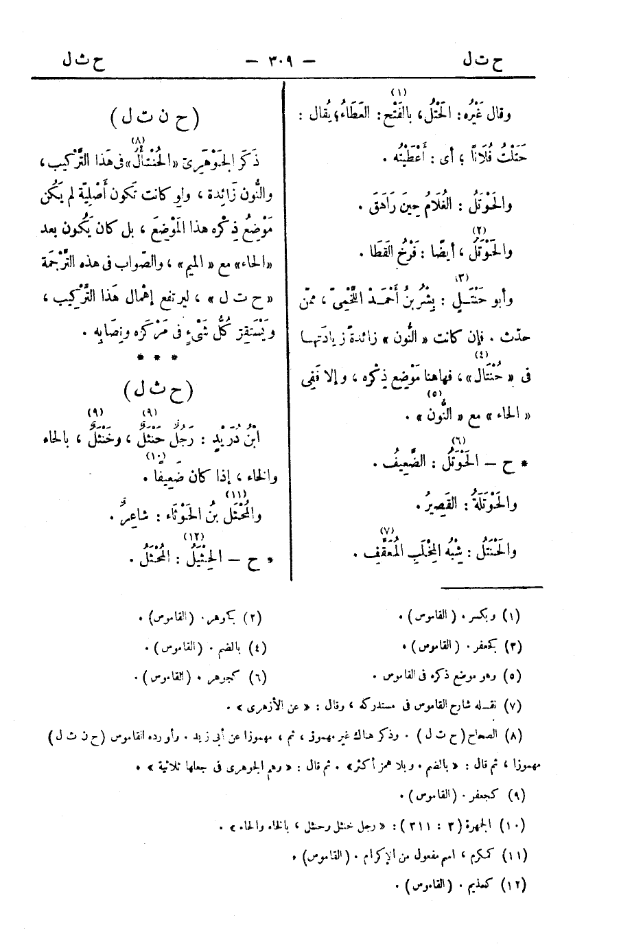 ذكرَ الجوهريُّ " الحُنْتَأْلَ " في هذا التَّرْكِيبِ، والنُّونُ زائدةٌ، ولو كانت تكونُ أَصْلِيَّةً لم يَكُنْ مَوْضِعُ ذِكْرِه هذا المَوْضِعَ، بل كانَ يكونُ بَعْدَ " الحاءِ " مَعَ " الميمِ "، والصَّوابُ في هذه التَّرْجَمَةِ " ح ت ل "، لِيَرْتَفِعَ إهْمَالُ هذا التَّرْكِيبِ، ويَسْتَقِرَّ كُلُّ شَيْءٍ في مَرْكَزِه ونِصَابِه.