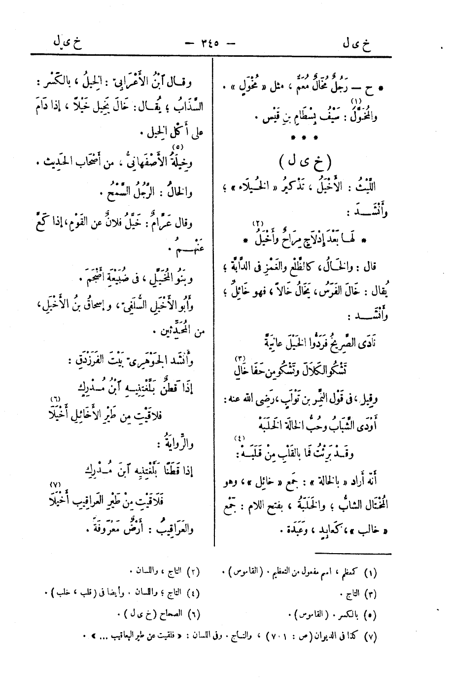 قال: والخَالُ، كالظَّلْعِ والغَمْزِ في الدَّابَّةِ؛ يُقالُ: خَالَ الفَرَسُ، يَخَالُ خَالًا، فهو خَائِلٌ؛ وأنشدَ: