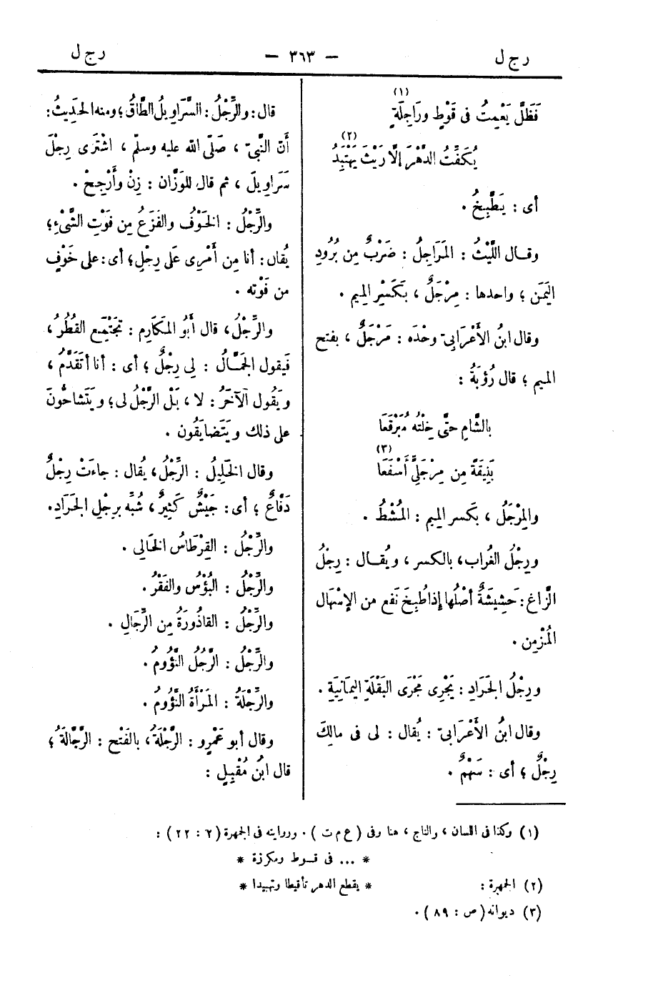 وقال الخَلِيلُ: الرِّجْلُ، يُقالُ: جَاءَتْ رِجْلٌ دَفَّاعٌ؛ أي: جَيْشٌ كَثِيرٌ، شُبِّهَ بِرِجْلِ الجَرَادِ.
