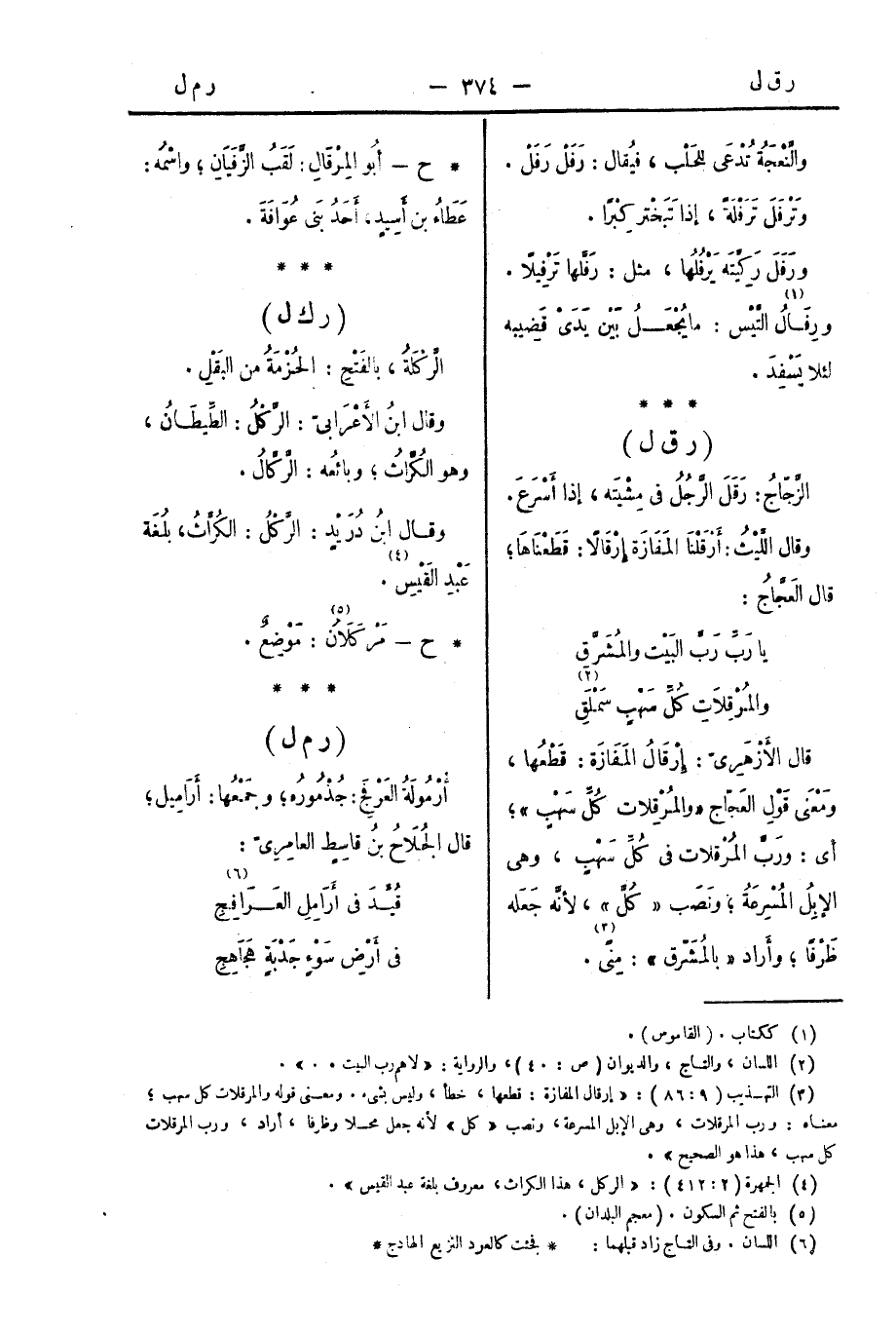 قال الأزهريُّ: إِرْقَالُ المَفَازَةِ: قَطْعُها، ومَعْنَى قَوْلِ العَجَّاجِ " والمُرْقِلاتِ كُلَّ سَهْبٍ "؛ أي: ورَبَّ المُرْقِلاتِ في كُلِّ سَهْبٍ، وهِيَ الإِبِلُ المُسْرِعَةُ؛ ونَصَبَ " كُلَّ "، لأنَّهُ جَعَلَهُ ظَرْفًا؛ وأرادَ " بالمُشَرَّقِ ": مِنًى.