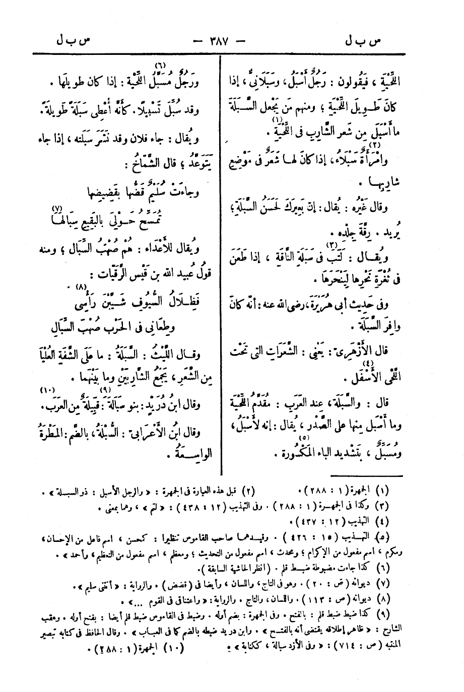 اللِّحْيَةِ، فيقولون: رَجُلٌ أَسْبَلُ، وسَبَلانِيٌّ، إذا كانَ طَوِيلَ اللِّحْيَةِ؛ ومِنْهُم مَنْ يَجْعَلُ السَّبَلَةَ ما أَسْبَلَ مِنْ شَعَرِ الشَّارِبِ في اللِّحْيَةِ.