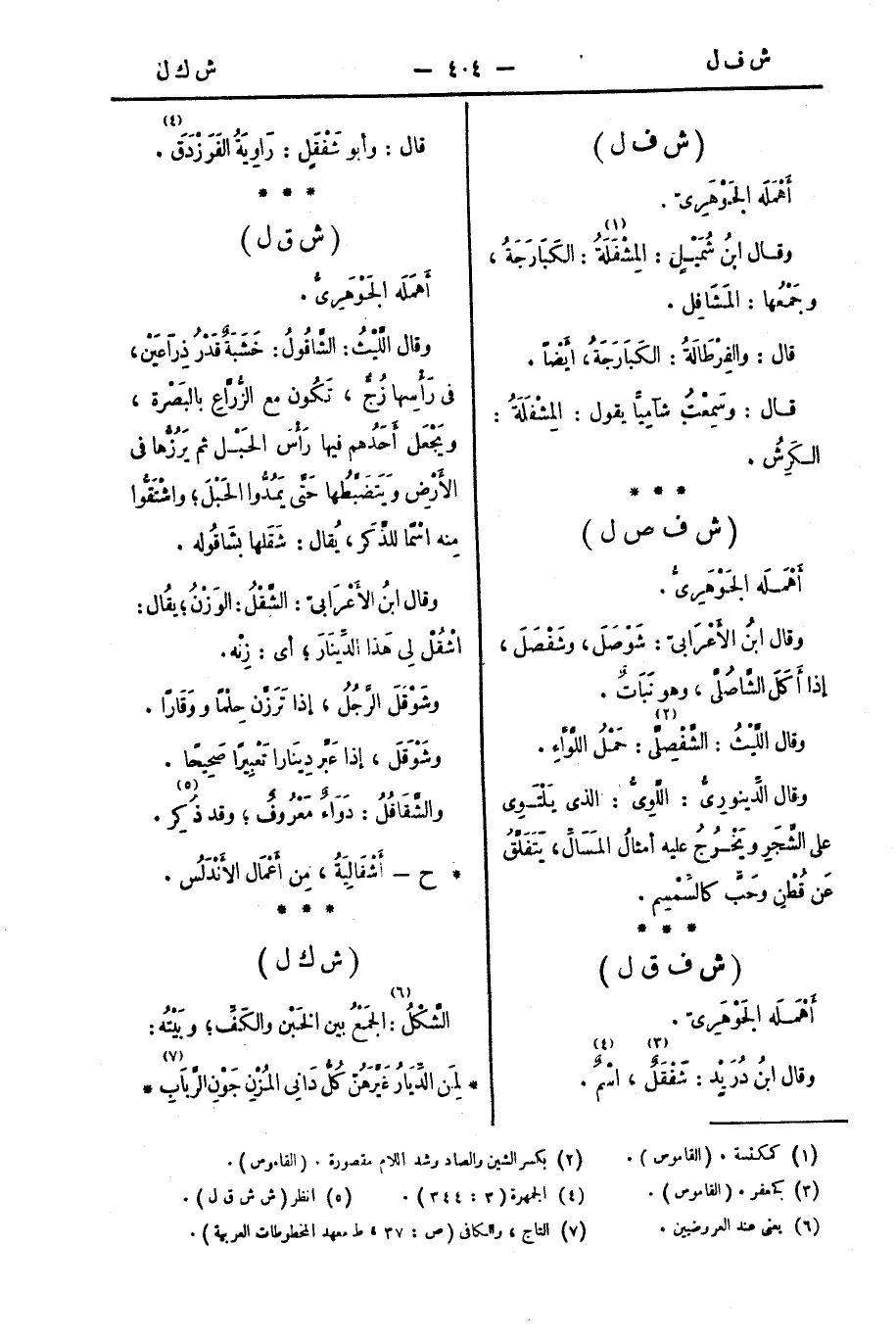 وقال ابنُ شُمَيْلٍ: المِشْفَلَةُ: الكَبَارَجَةُ، وجَمْعُها: المَشَافِلُ.